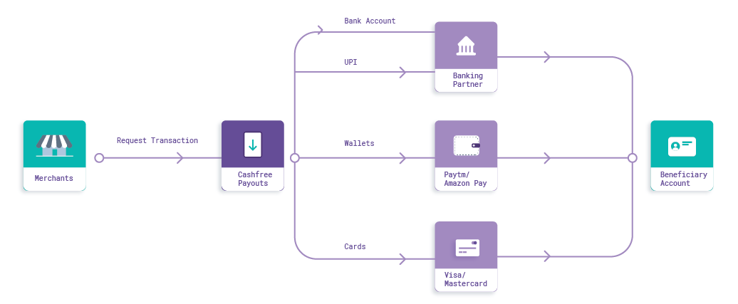 - Manage multiple payout methods: IMPS, NEFT, UPI, Mastercard (MoneySend), Visa (Visa Direct), and digital wallets (Amazon Pay & Paytm).