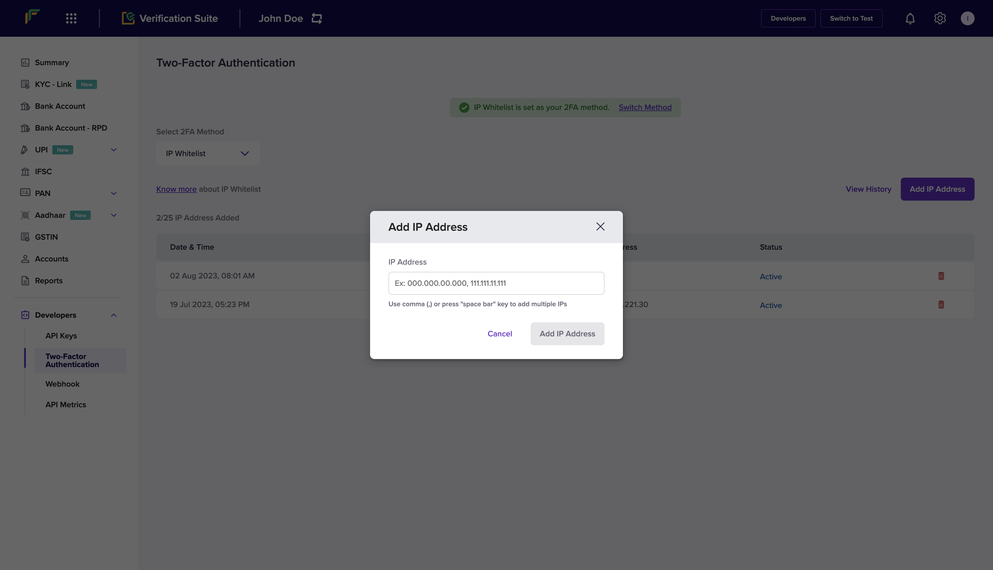 - Enter the IP address you want to whitelist in the respective field and click Add IP Address to save the details. Note that the IPv4 has to be whitelisted, and not IPv6. The whitelisted IPs are displayed in the grid as shown below. You can whitelist a maximum of 10 IPs.