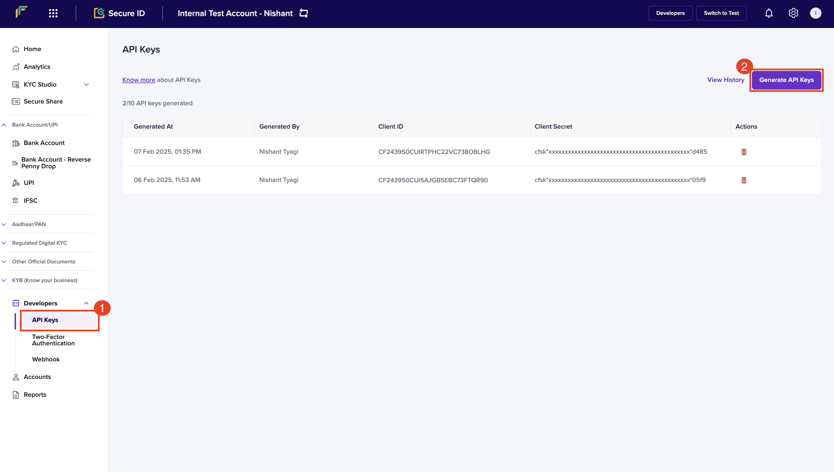 Follow the instructions below to generate API keys:- From the Secure ID dashboard, click Developers on the navigation panel.