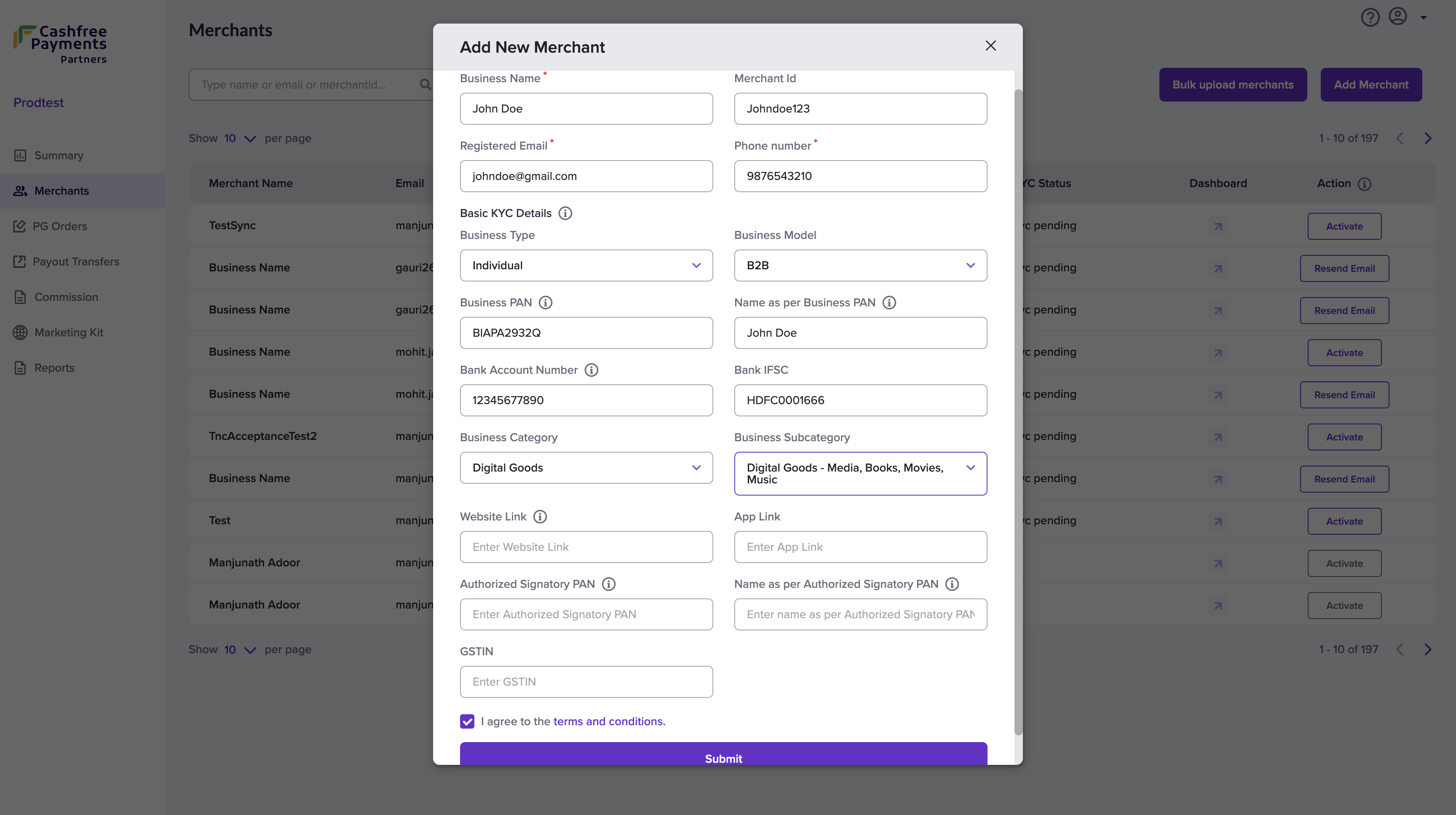 For faster onboarding and KYC verification, you can submit the merchants’ basic KYC details.