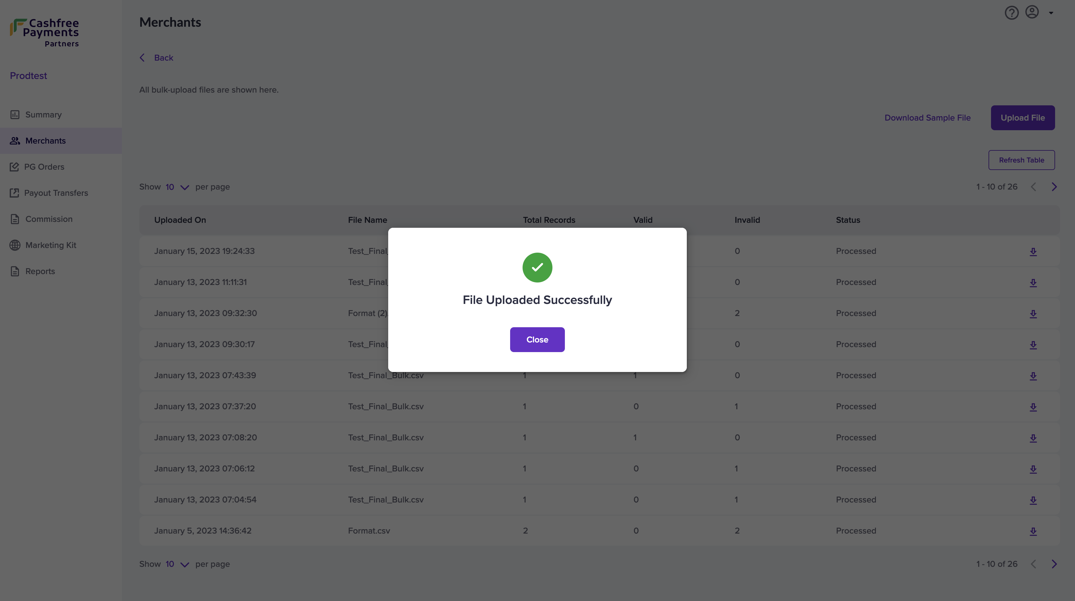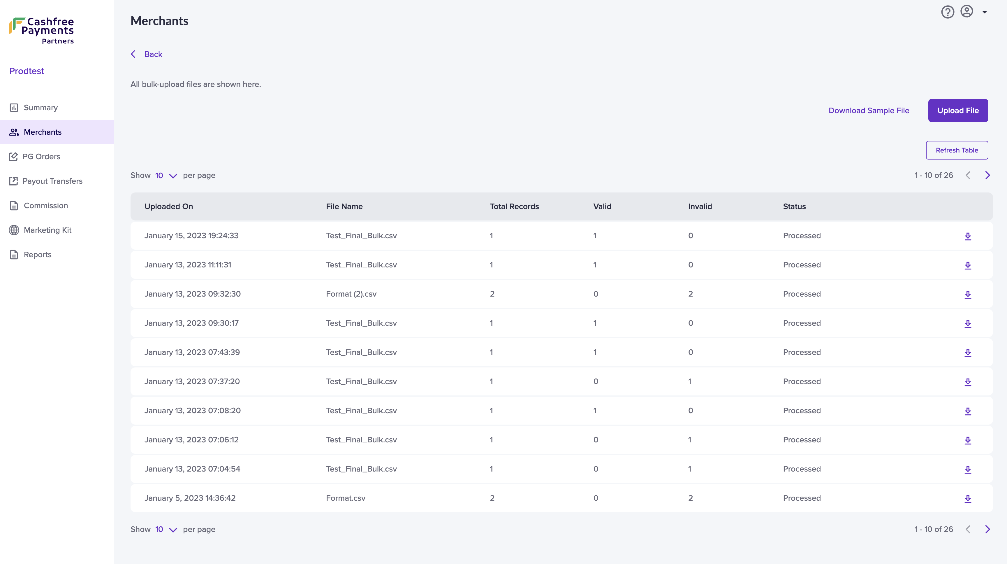 You can also specify the business details, PAN, and bank account details of the merchants for KYC verification, if required. - Details like the number of merchants added to the file, how many are valid/invalid, and the status of the uploaded file will be displayed after the file is successfully uploaded. You can download the file and correct any errors in the file and upload it again.