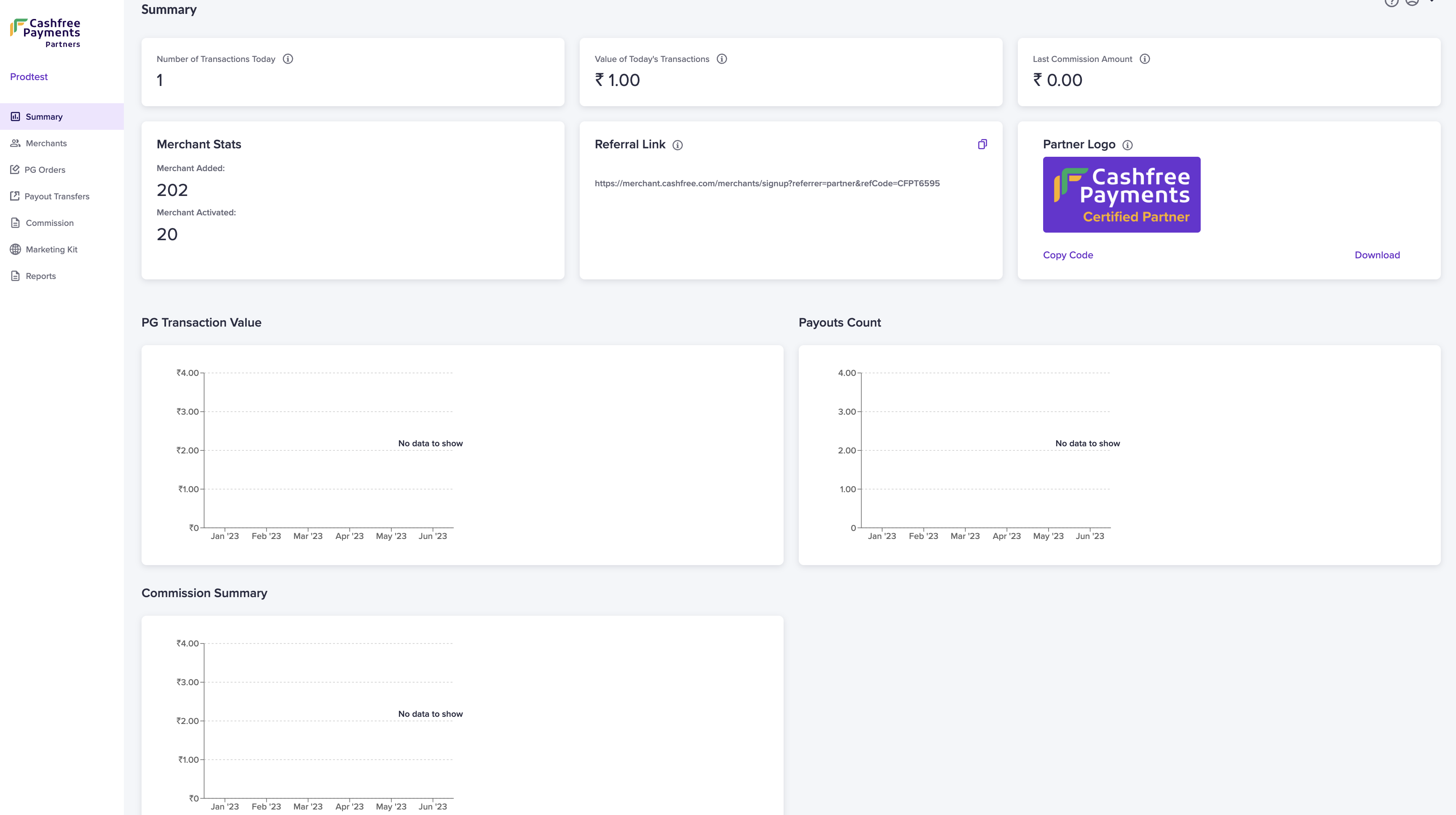 The Summary screen gives you details about your daily transactions, like the current-day transaction count, the value of the transactions made by your merchants, and the last commission amount you received from Telr as per the referral program. The following details are available on this page -- Number of Transactions Today - Total number of PG and Payout transactions done by your merchants.