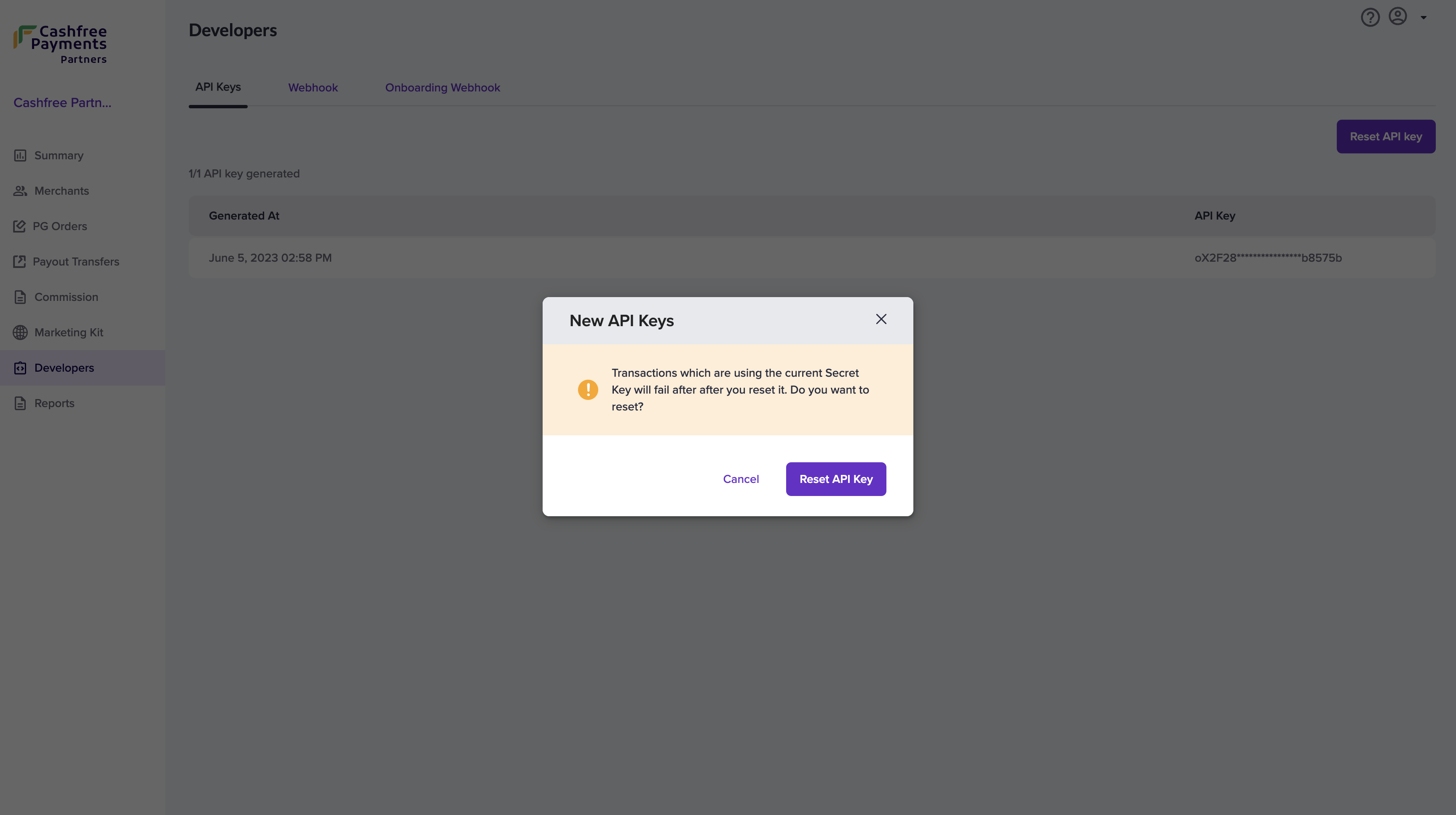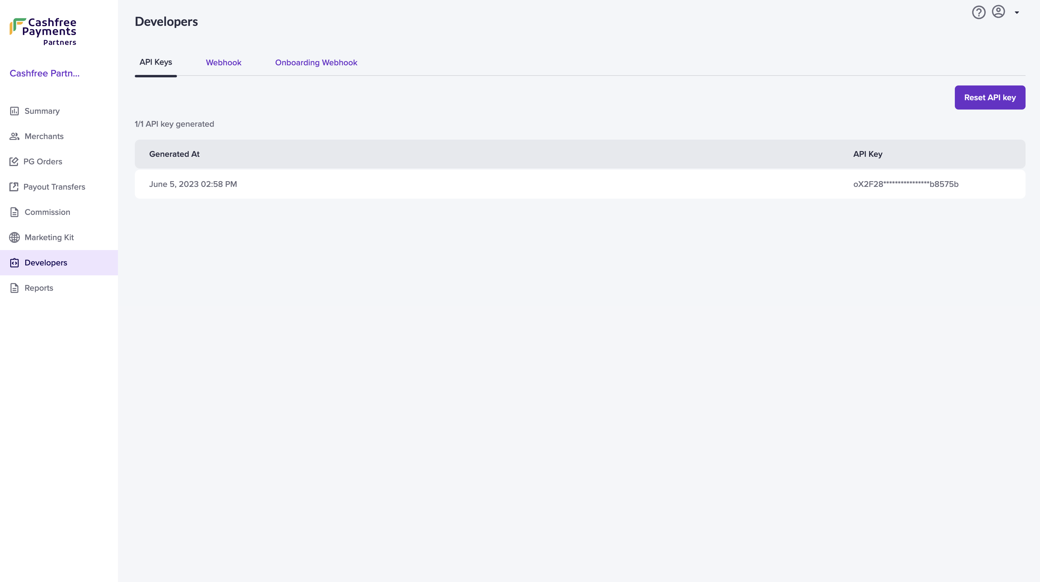 You can view the API keys and the time it was generated. You can also reset the API keys using the Reset API key option.