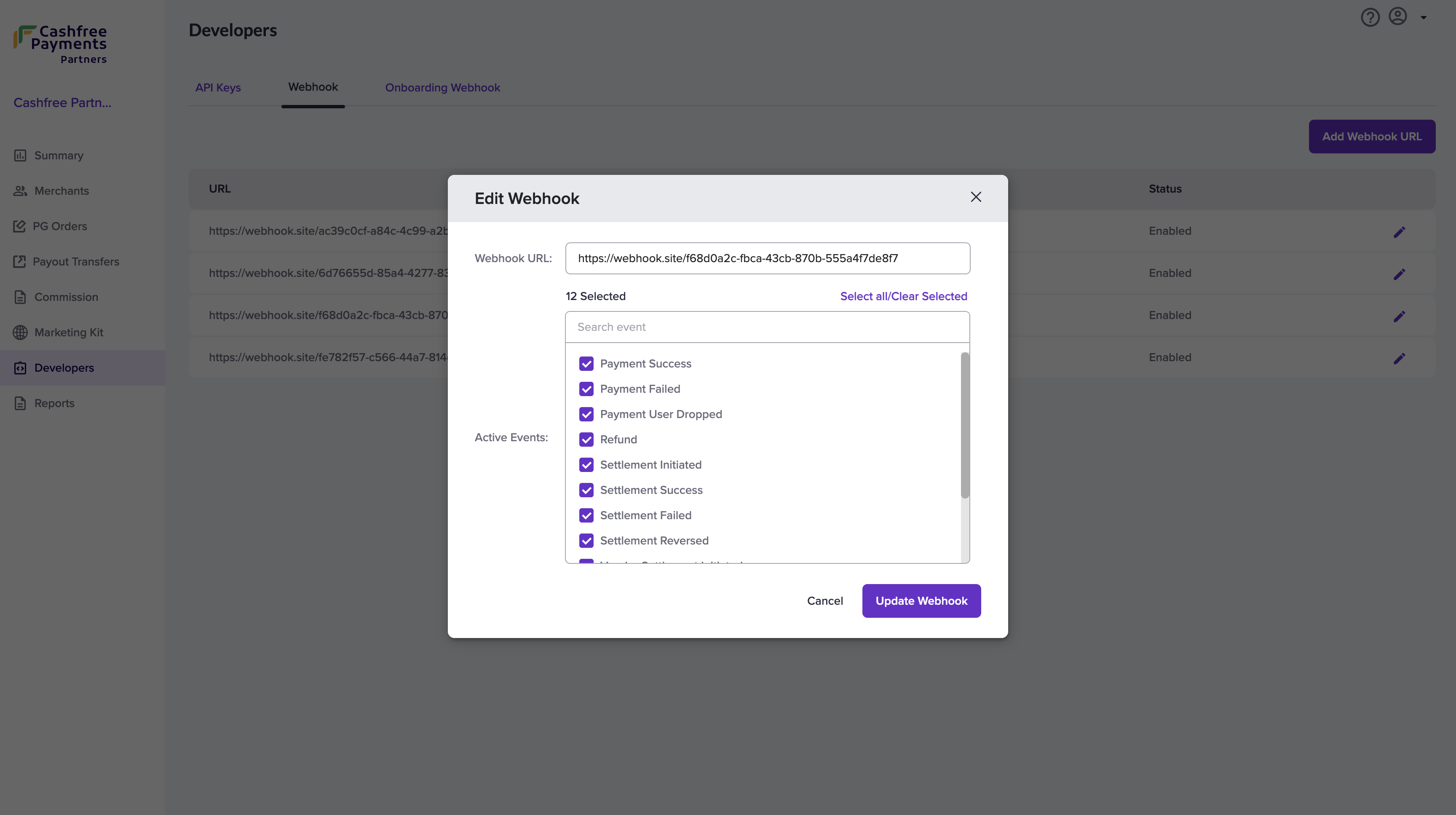 - Click the pencil icon beside each webhook to update the webhook. Edit the webhook URL, add/remove events from the list and click Update Webhook.