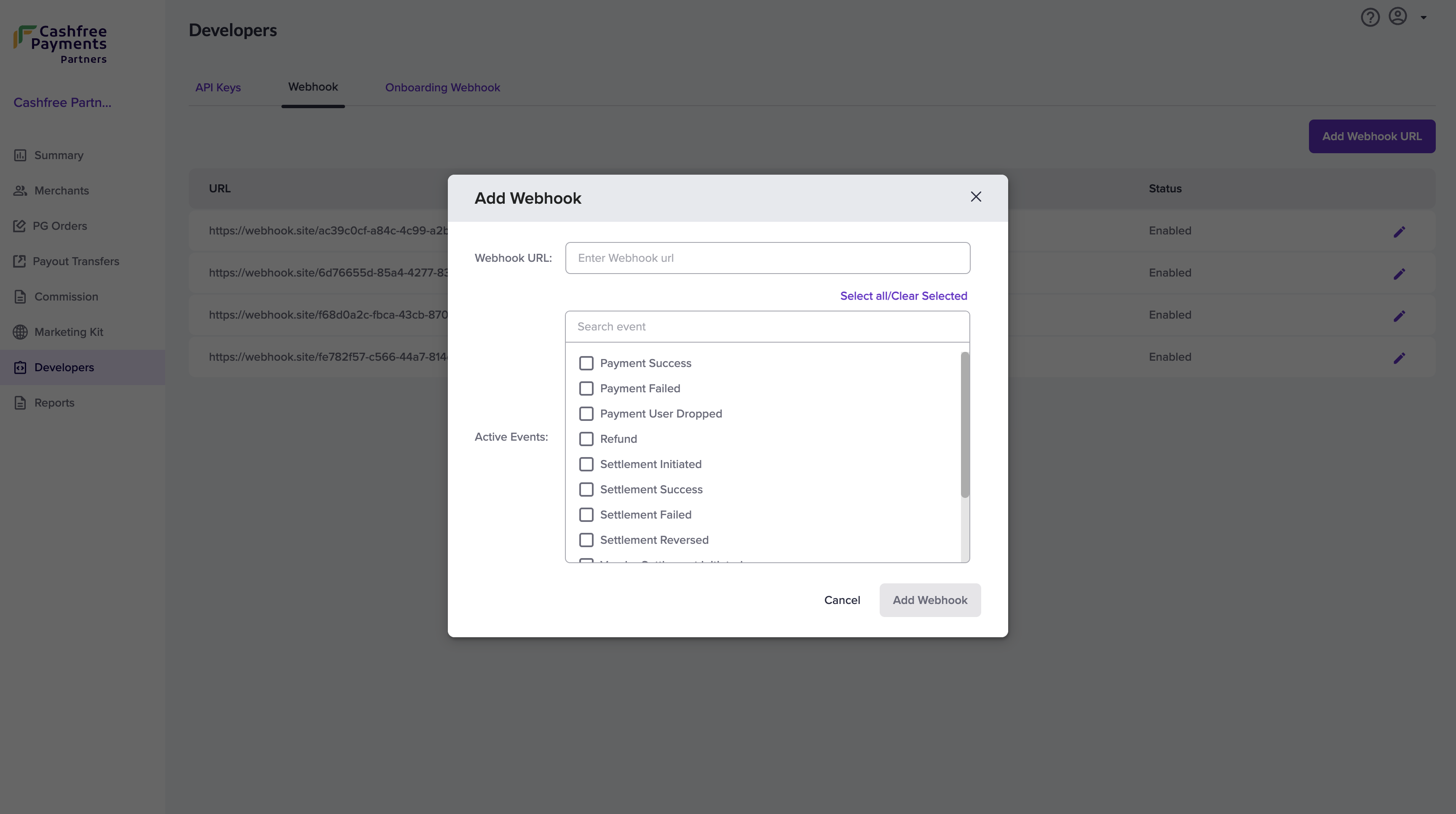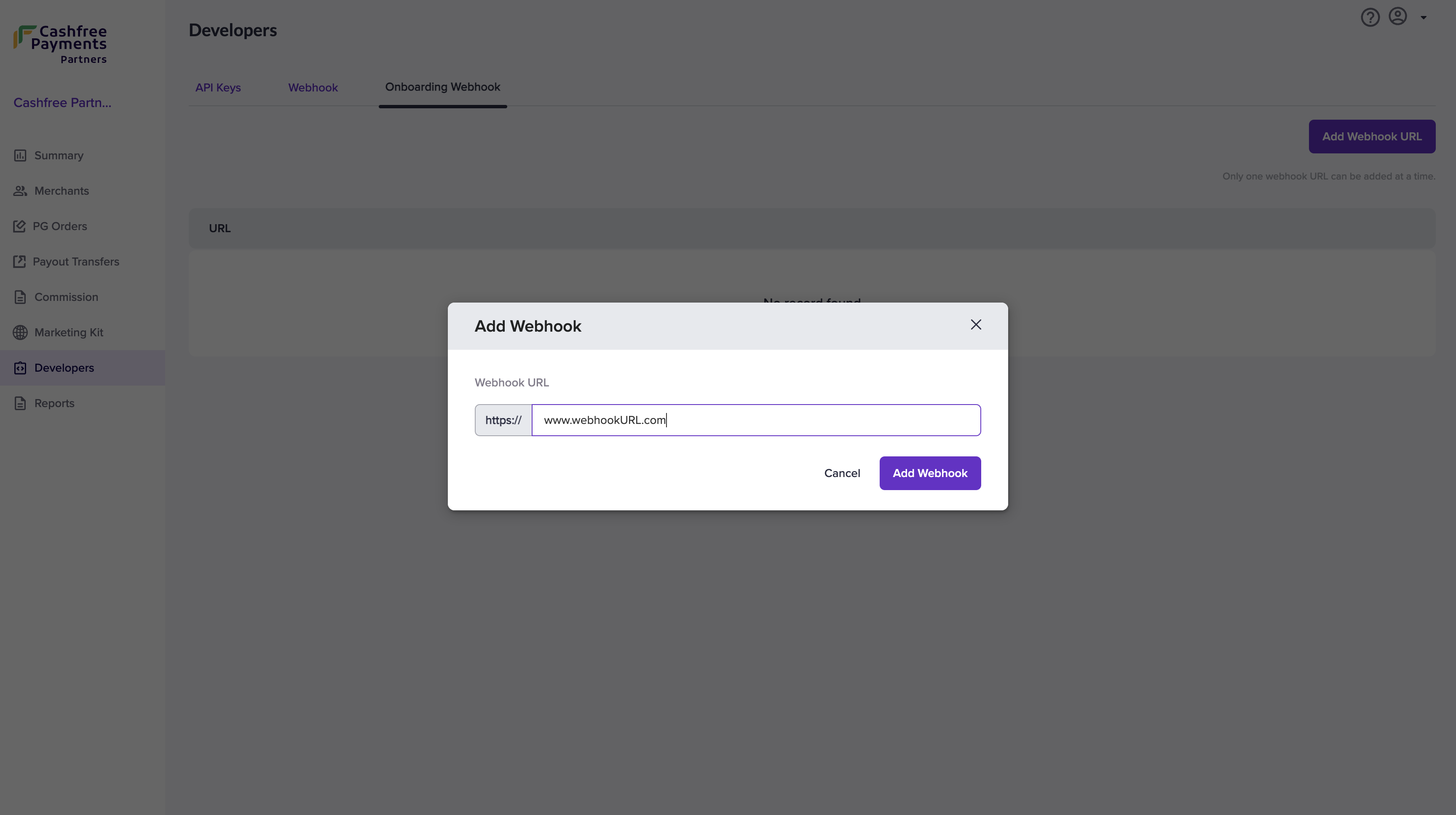 Add onboarding webhooks to build webhooks for your partners so that you can get the merchant lifecycle webhook events. To Add Onboarding Webhook,- Go to Embedded Payment Dashboard > Developers.