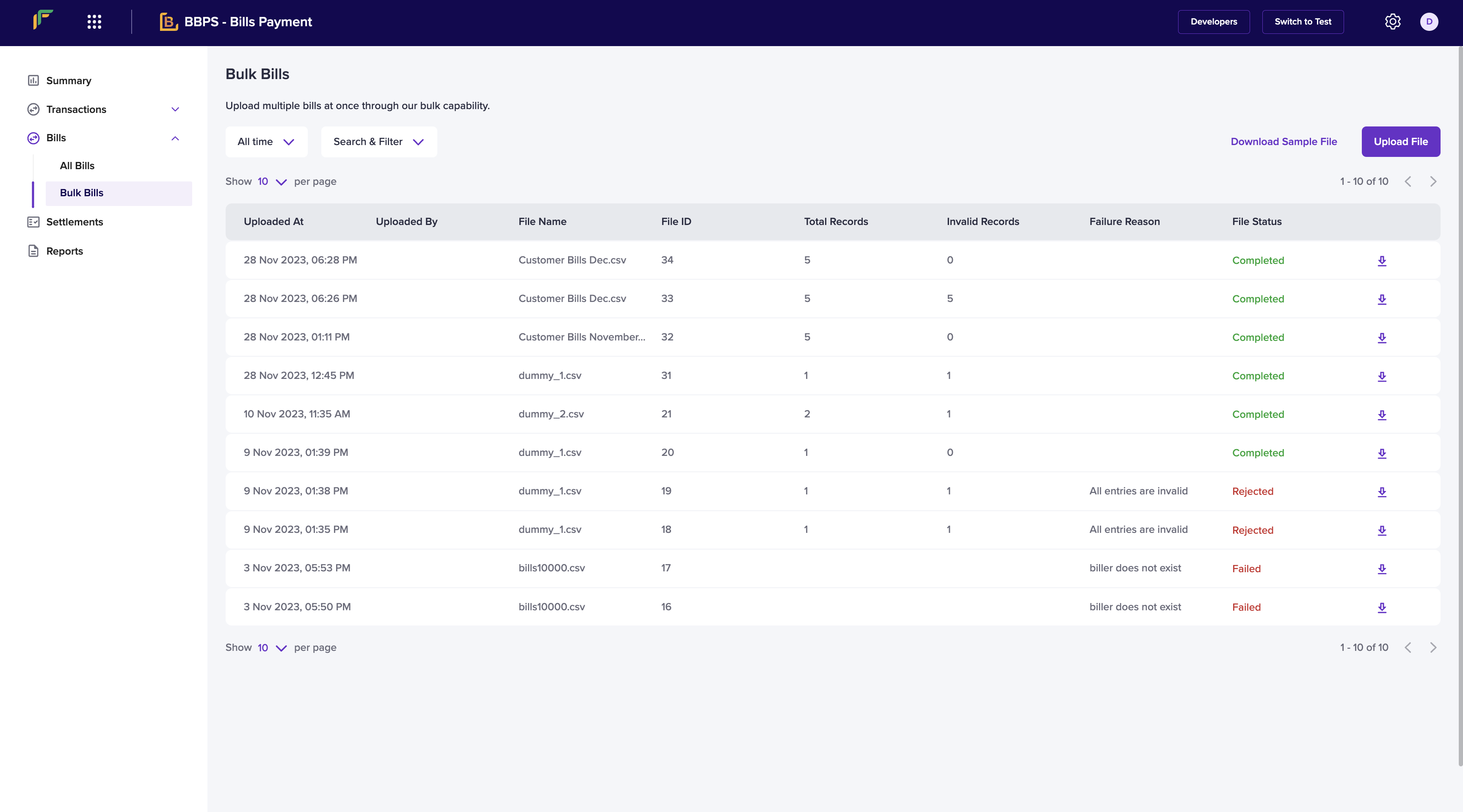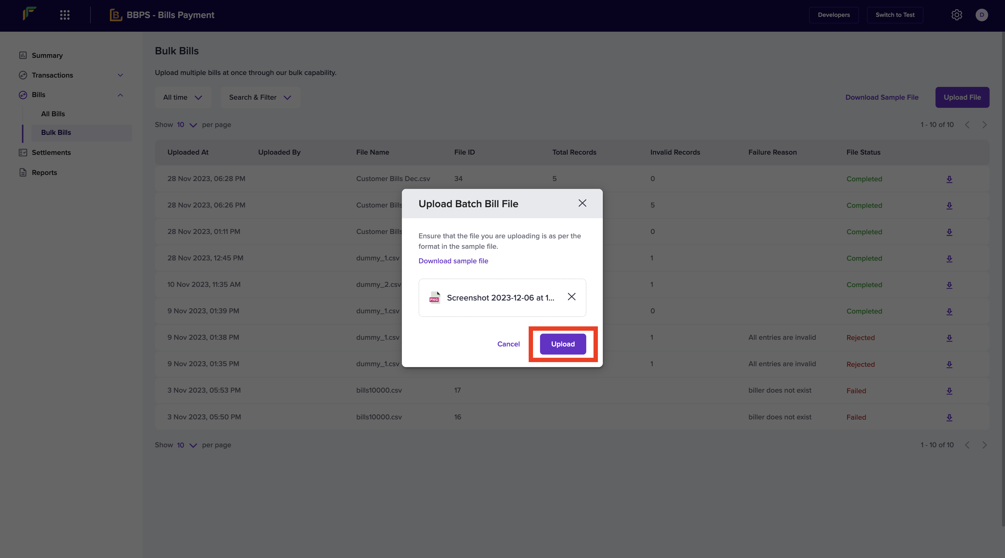 You can upload multiple bills at once using the Upload Batch Bill File functionality. Details such as -- Uploaded At - The time at which the bill was uploaded.