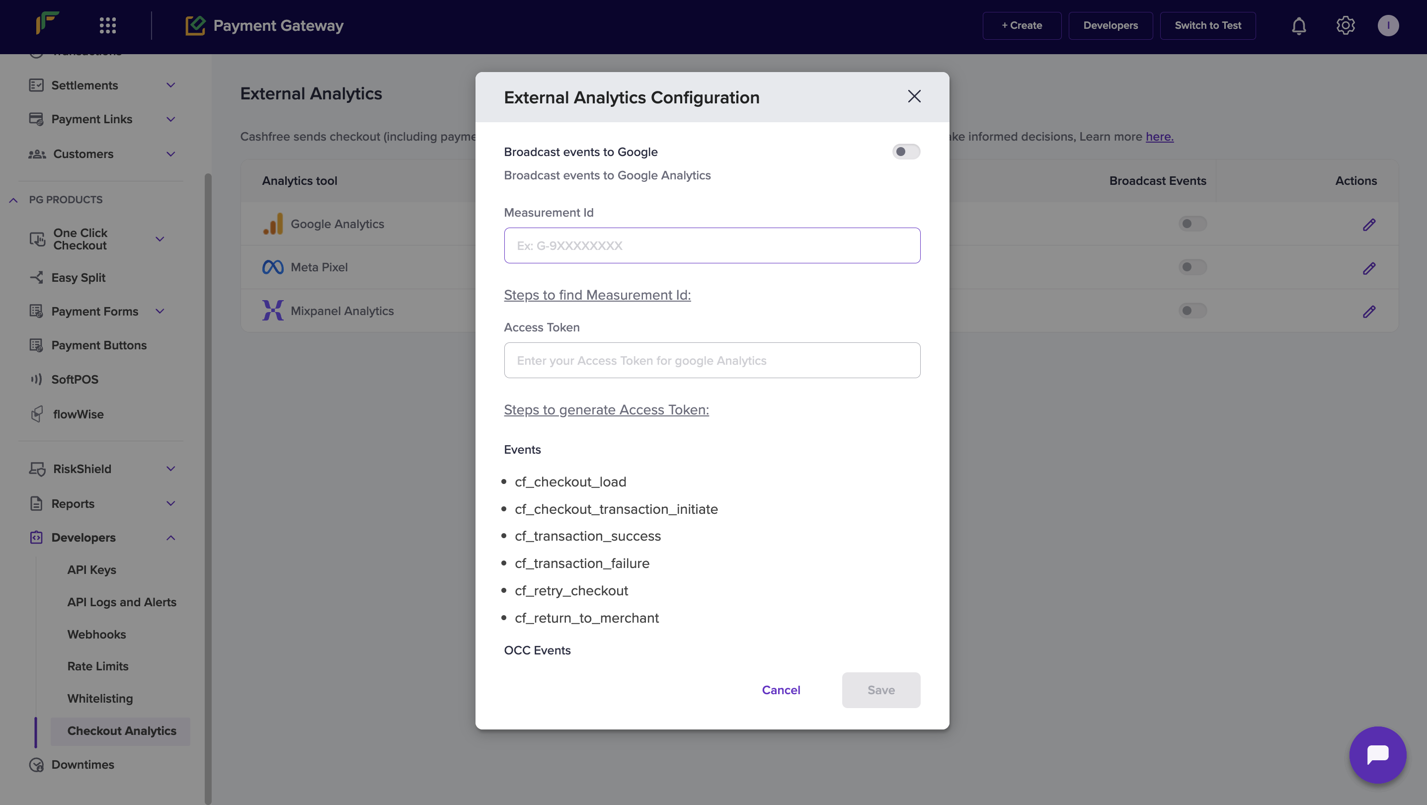 Set up Google Analytics by adding your Measurement ID and Access Token in the configuration modal.Find the Measurement ID