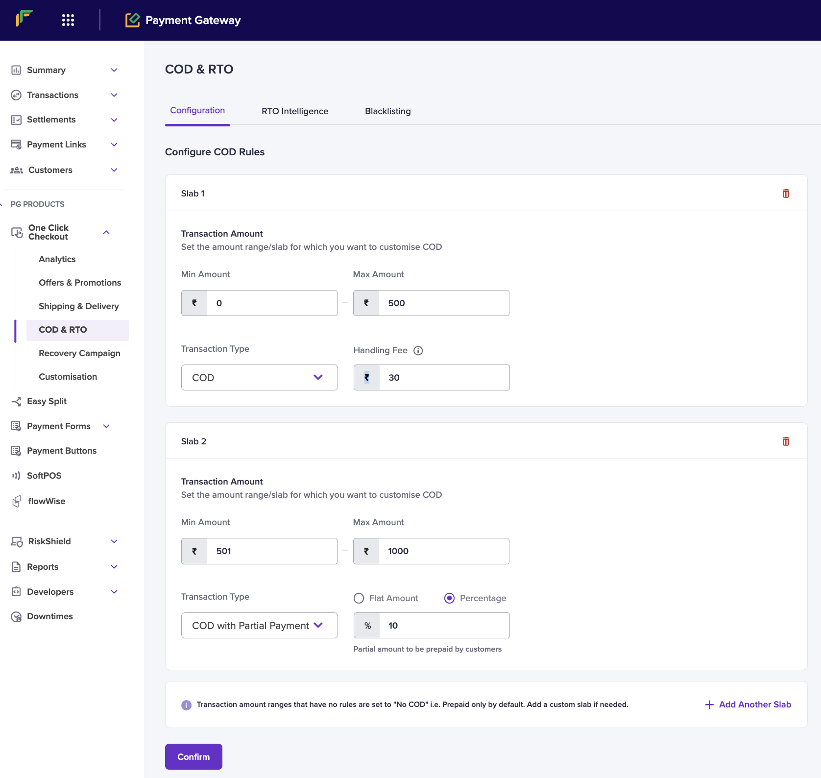 Note: If a transaction amount doesn’t match any rule, COD is disabled and the payment defaults to prepaid. Create custom slabs as needed.