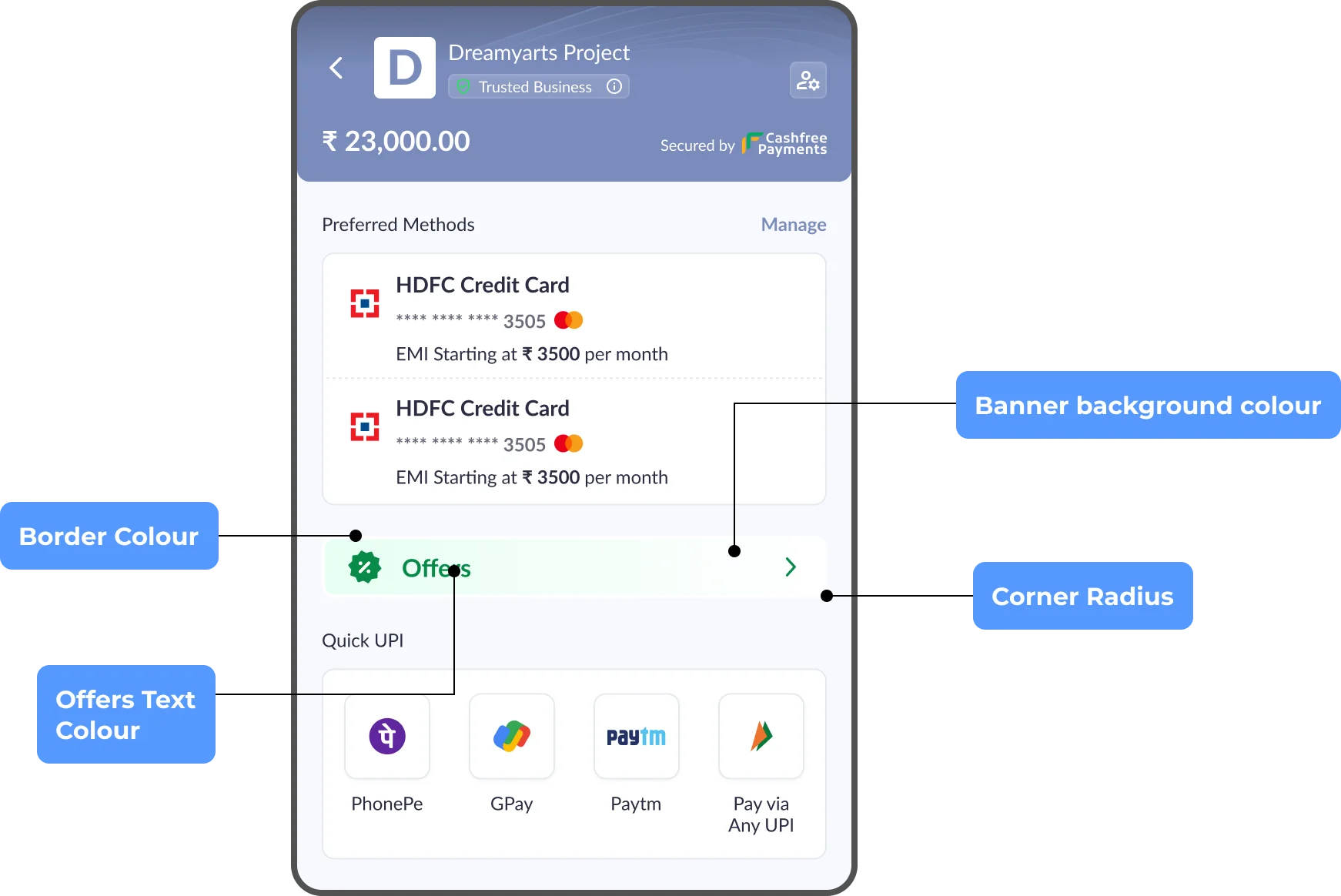 Quick configuration option allows you to customise checkout with minimalist branding like adding their primary colour on checkout.Configurations available: