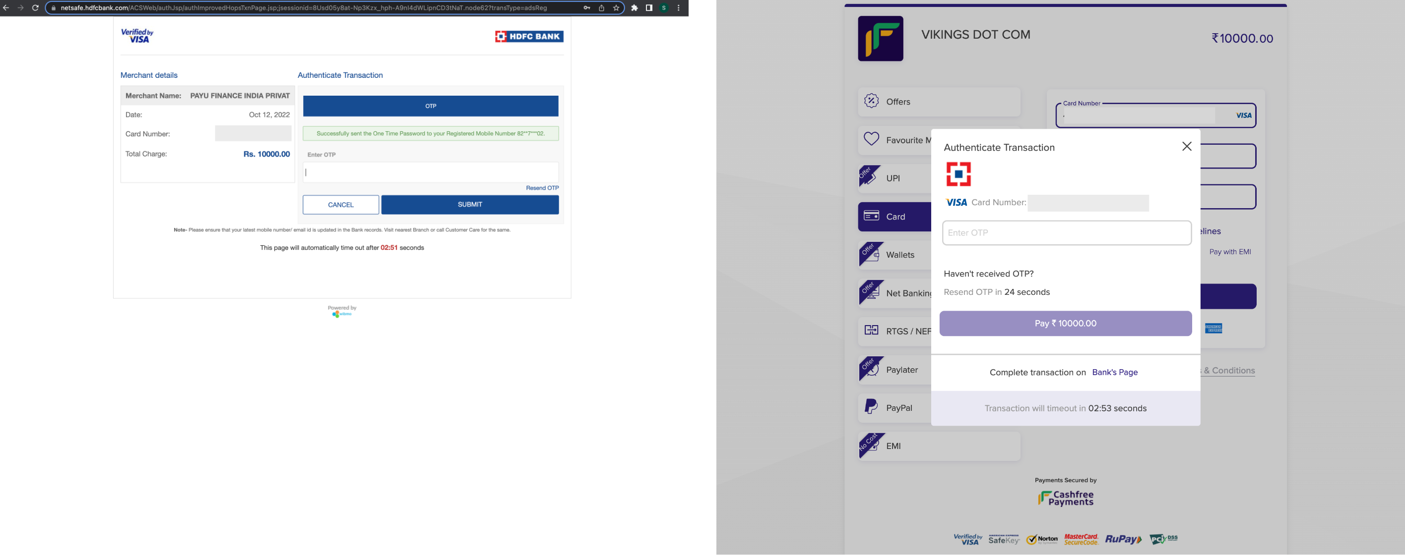 If the native OTP flow is enabled for the account, the response will return an action as post and an authentication API URL where you need to submit the OTP