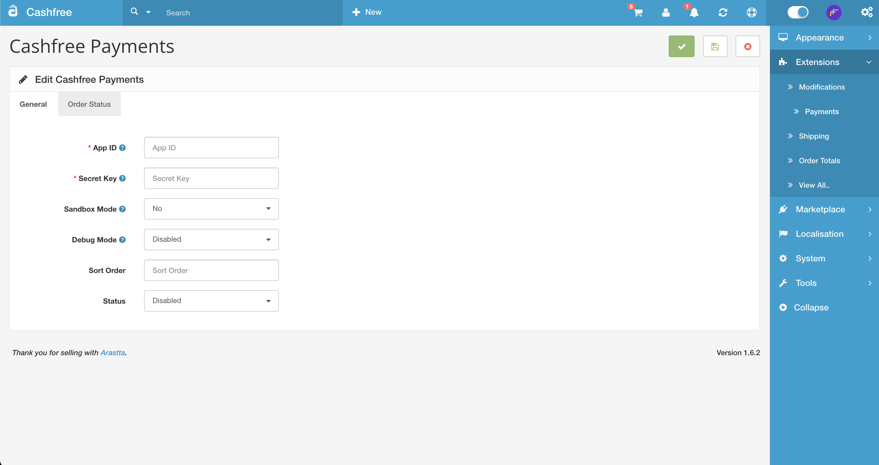 - In the OpenCart Dashboard, go to Admin Panel > Extensions. Select the extension type as Payments.