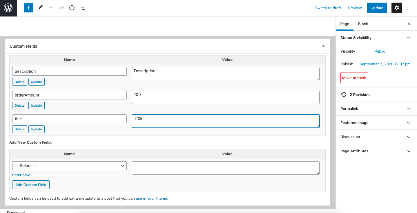 In the Preferences screen, enable the option Custom fields. You will now have the option to add custom fields to your WordPress page.