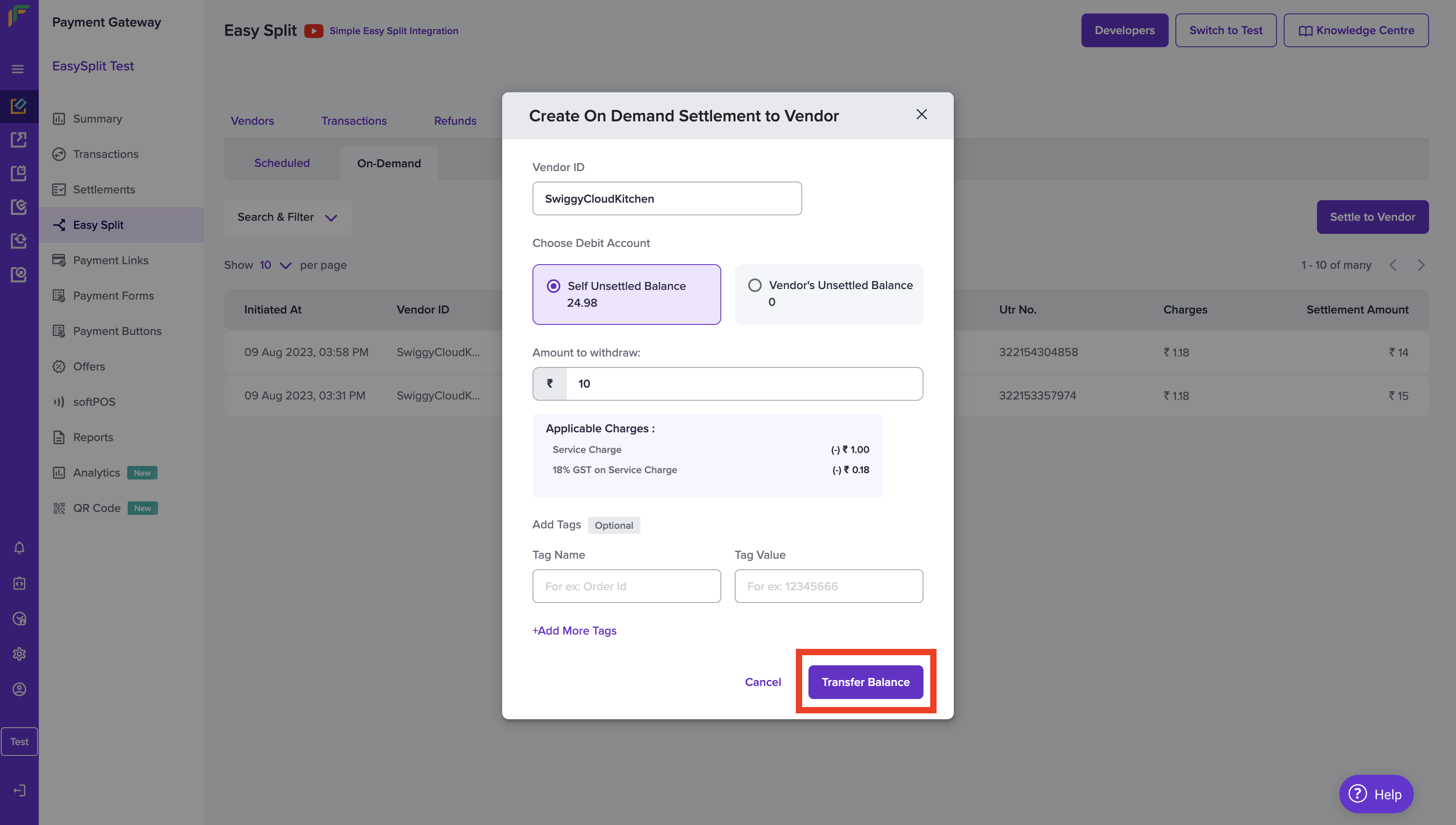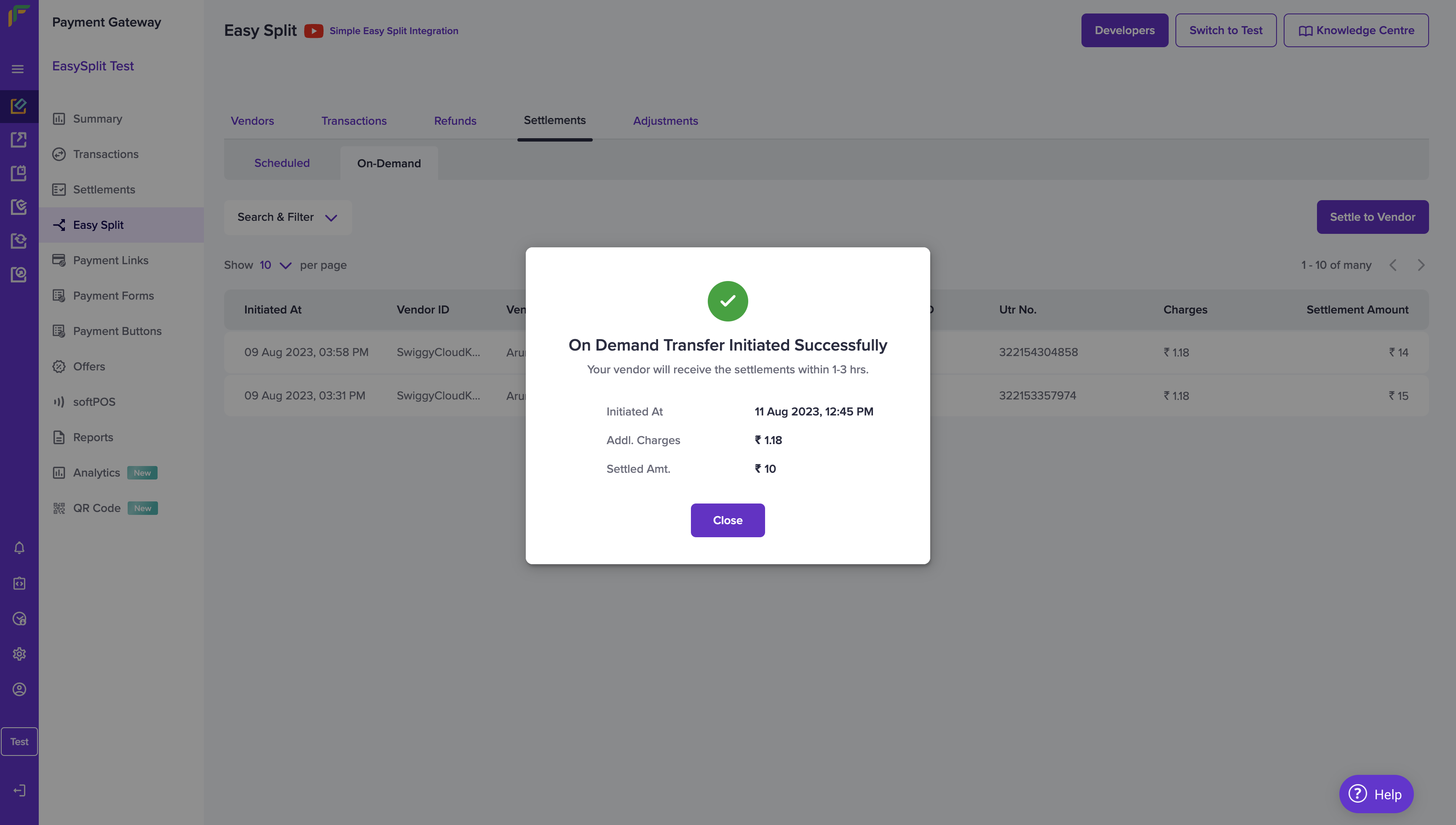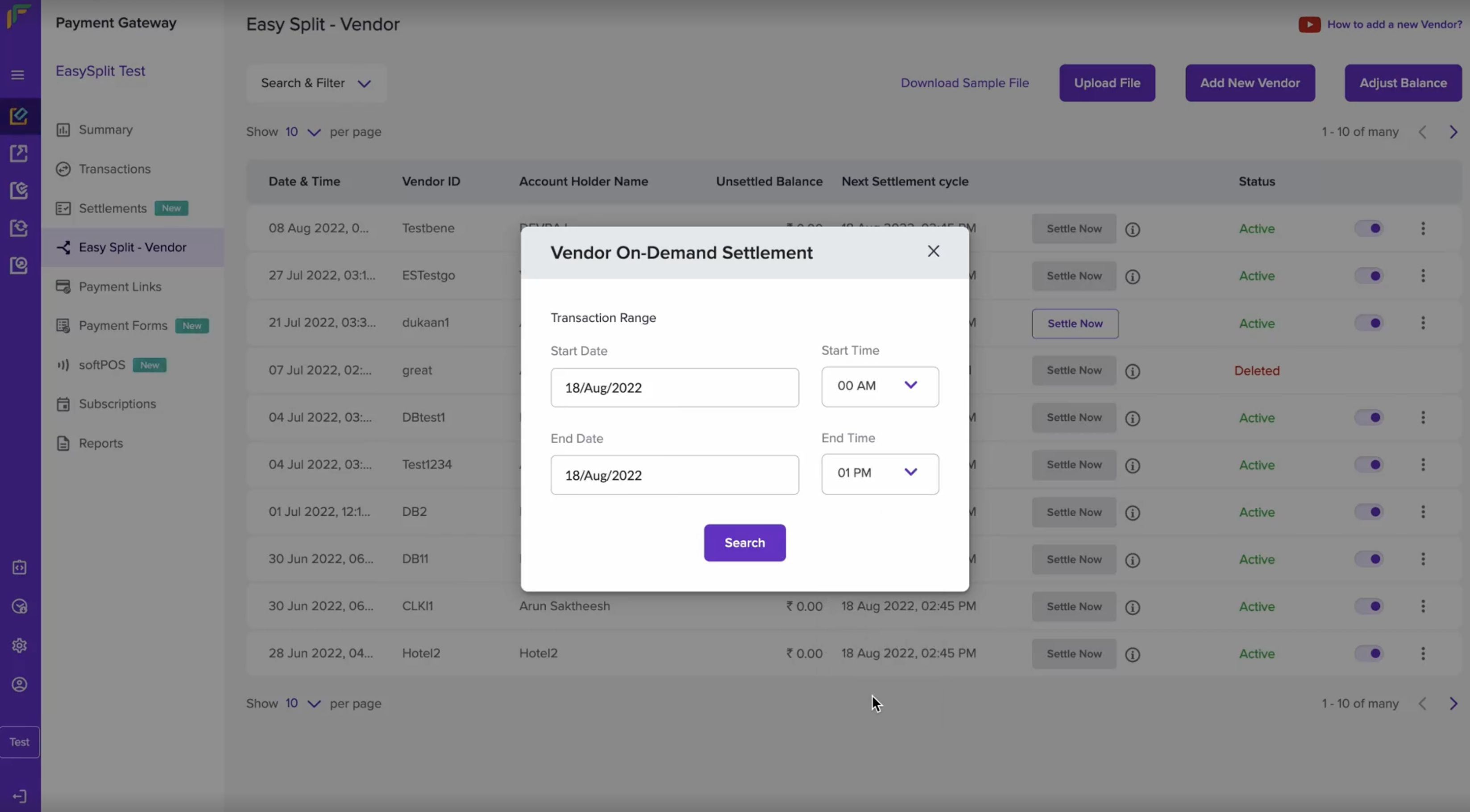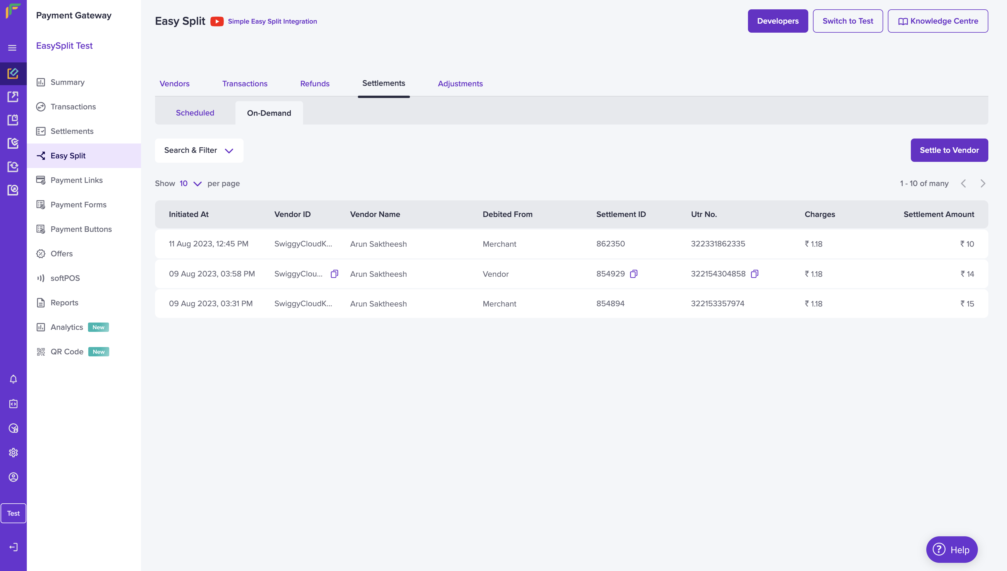 - Go to Payment Gateway Dashboard > Easy Split > Settlements > On-Demand > Settle to Vendor.