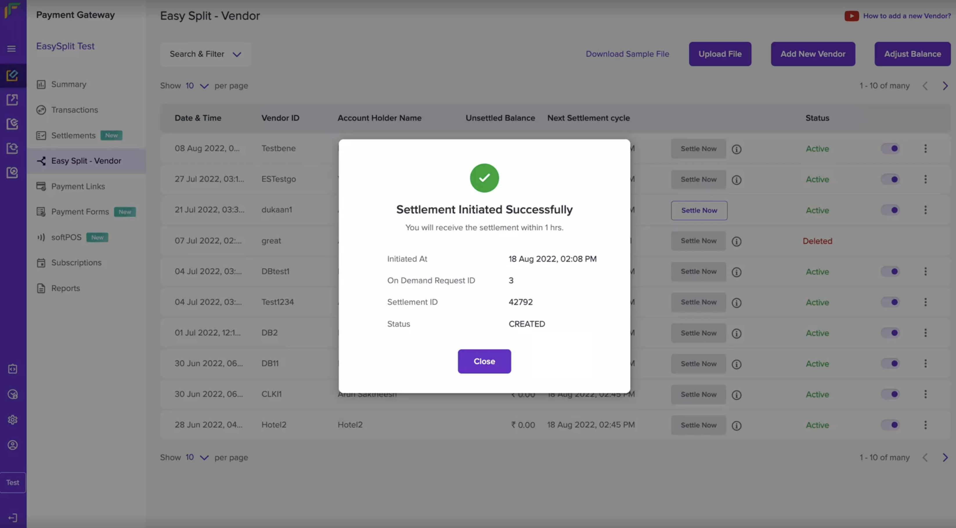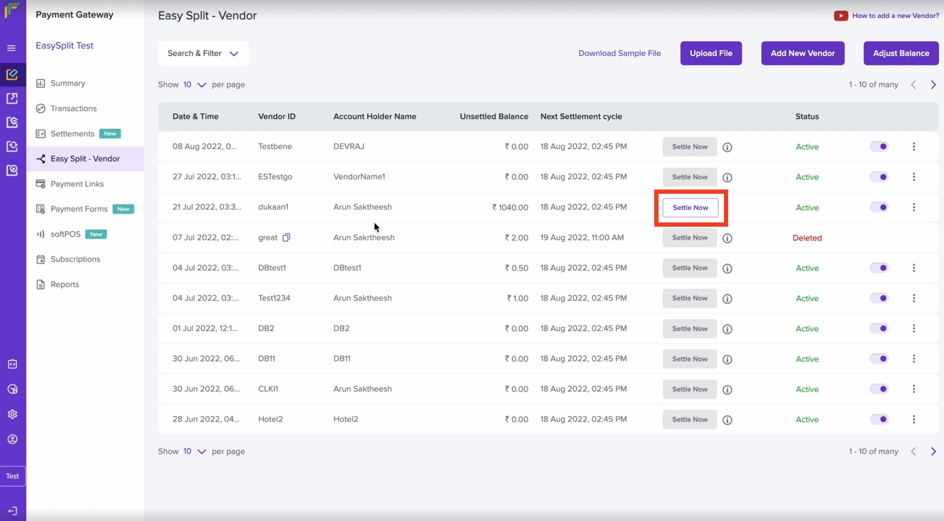 - Go to Payment Gateway Dashboard > Easy Split > Vendors > Settle Now.