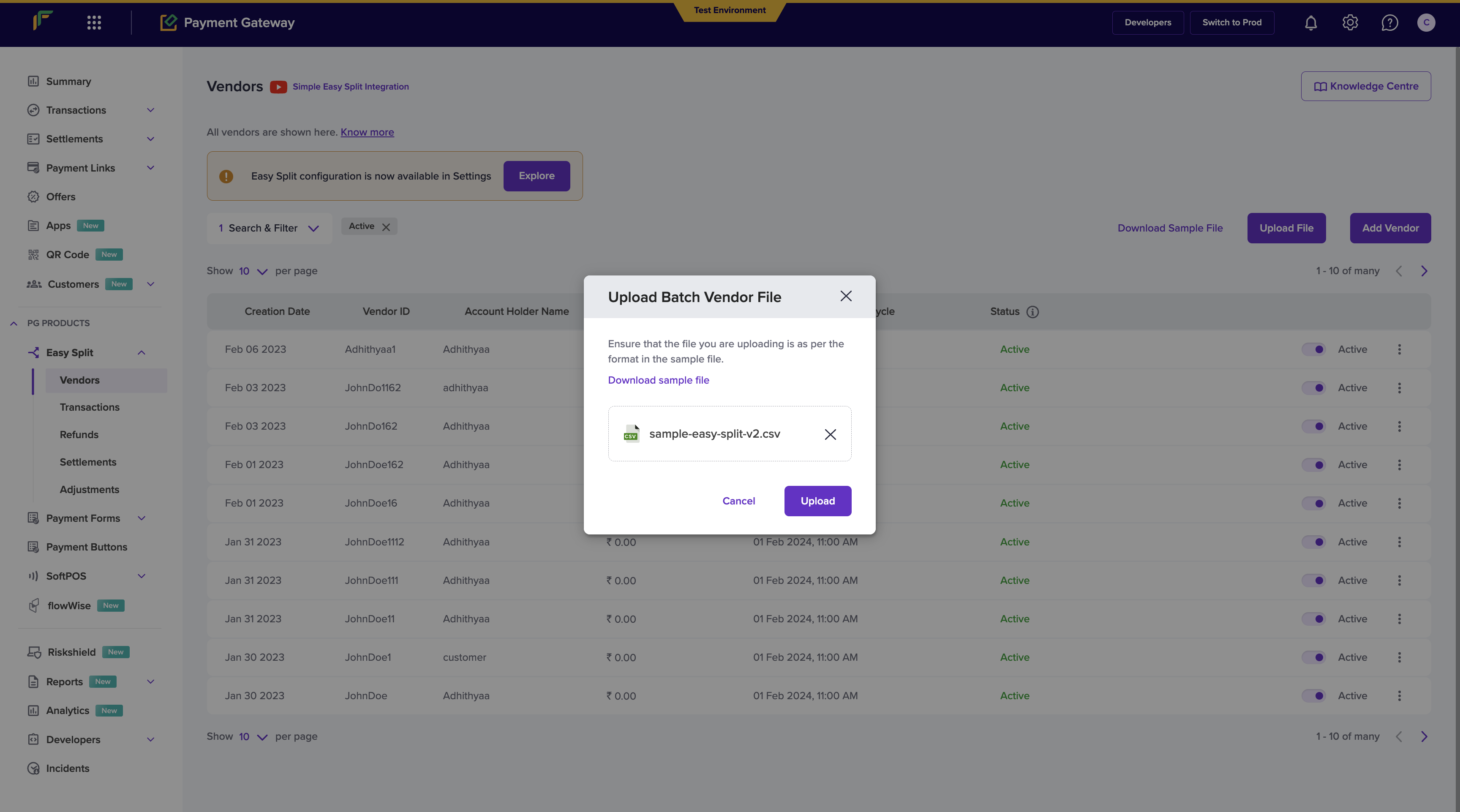 Use the Batch Upload feature to add a large number of vendors at a time. Add all the required details in a single file as per the required format and upload the file. Download the sample file to know what details are required to be filled in the batch file. To upload a batch file,- Go to Payment Gateway Dashboard > EasySplit - Vendor > click Upload File.