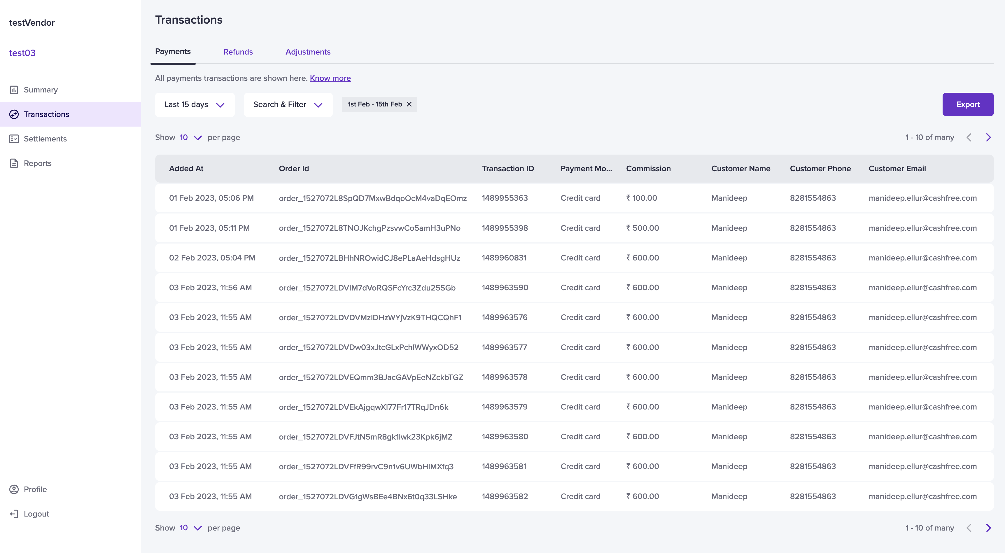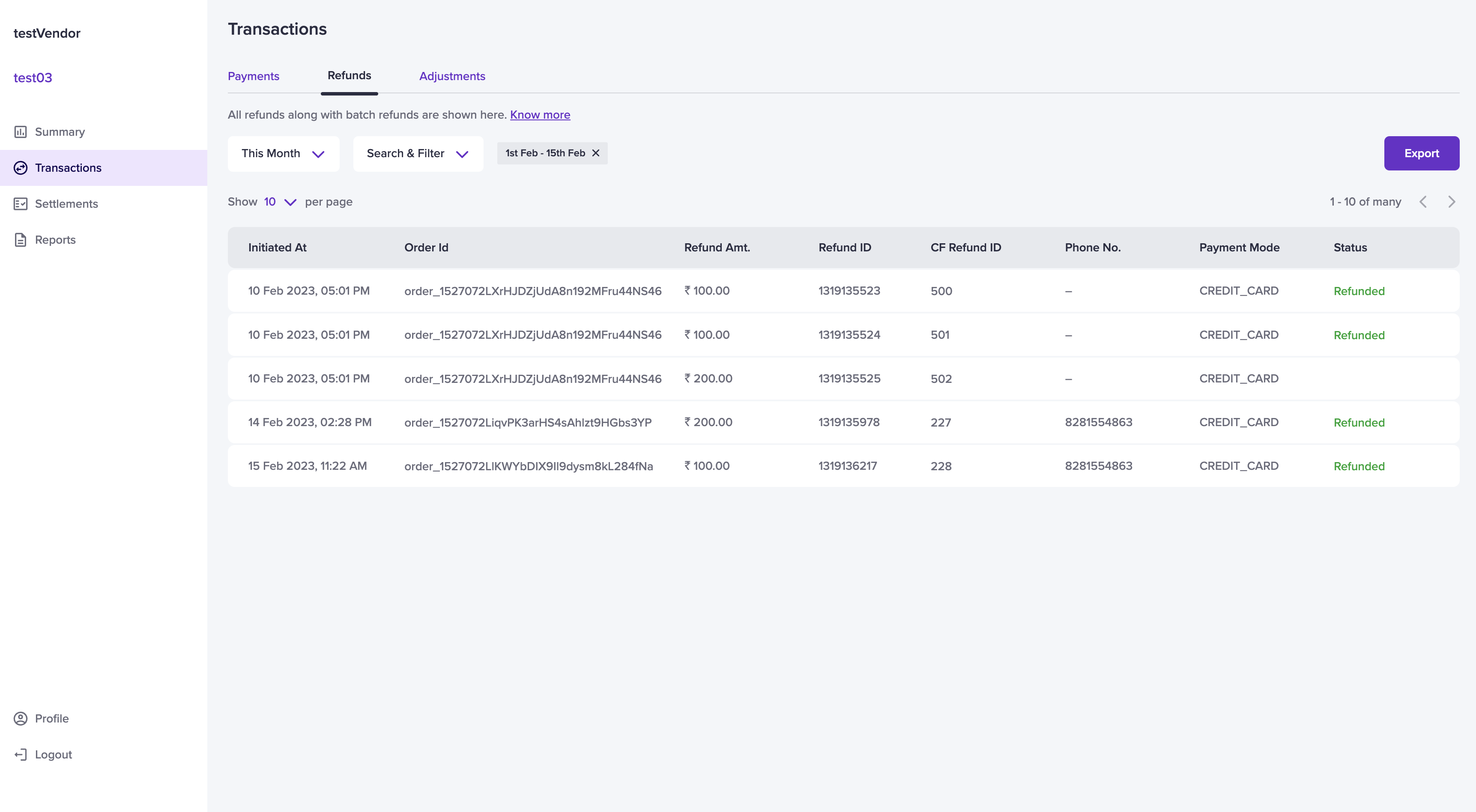 The refunds tab lists all the refunds along with the batch refunds that are initiated for that specific date range. In this section, vendors can see details such as: orderID, refund amount, refund ID, CF refund ID, customer phone number, payment mode, and the refund status. Use the Search and Filter options to search for any particular refund or filter the refunds based on the statuses. Click here to read more on refunds.