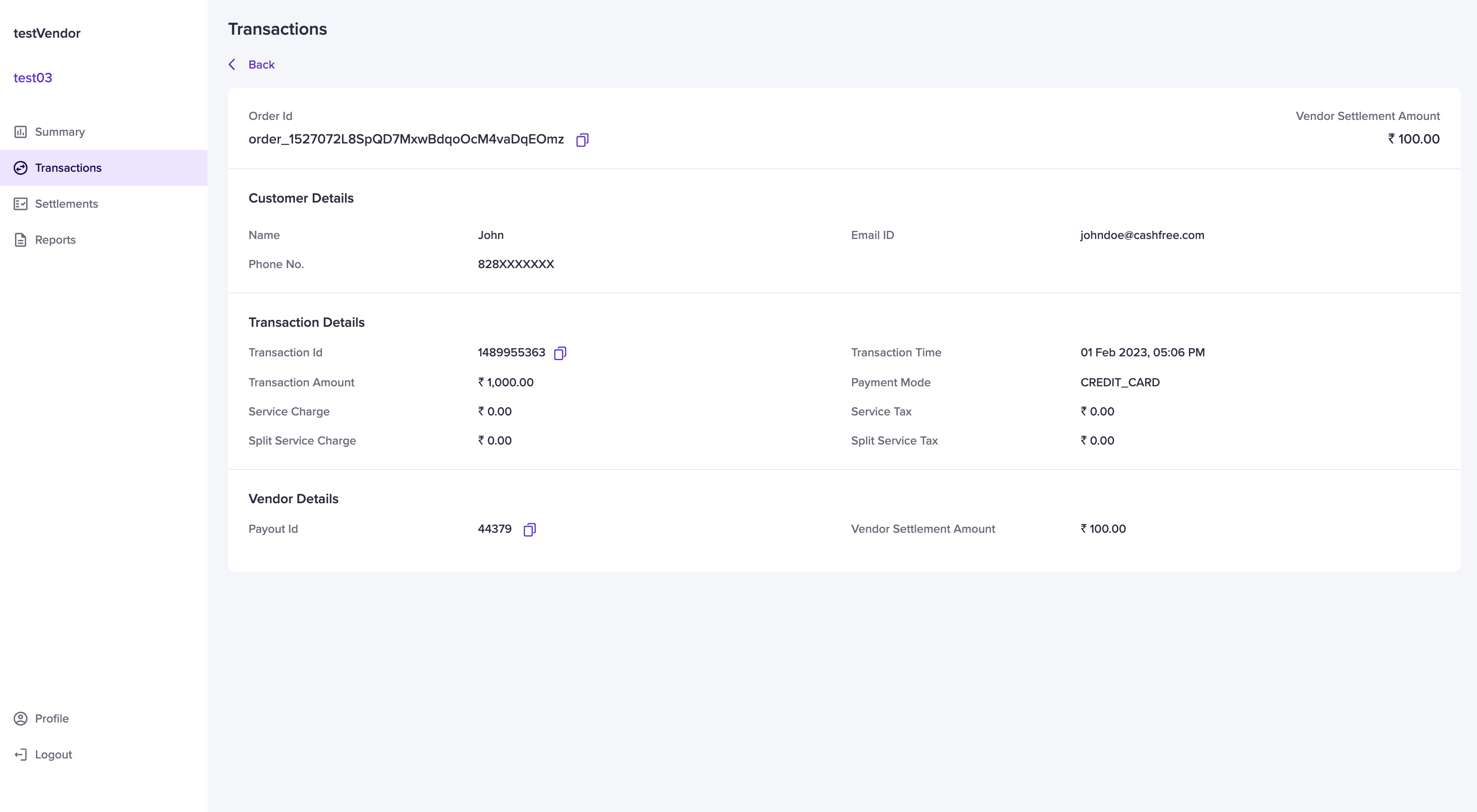The Payments tab displays all the payments your Vendor has made in the configured time period. In this section, vendors can see details such as: orderID, transaction ID, payment mode, commission, customer name, customer phone number, and customer email. Click on a particular payment to view more details about the payment. The detailed screen appears as shown below: