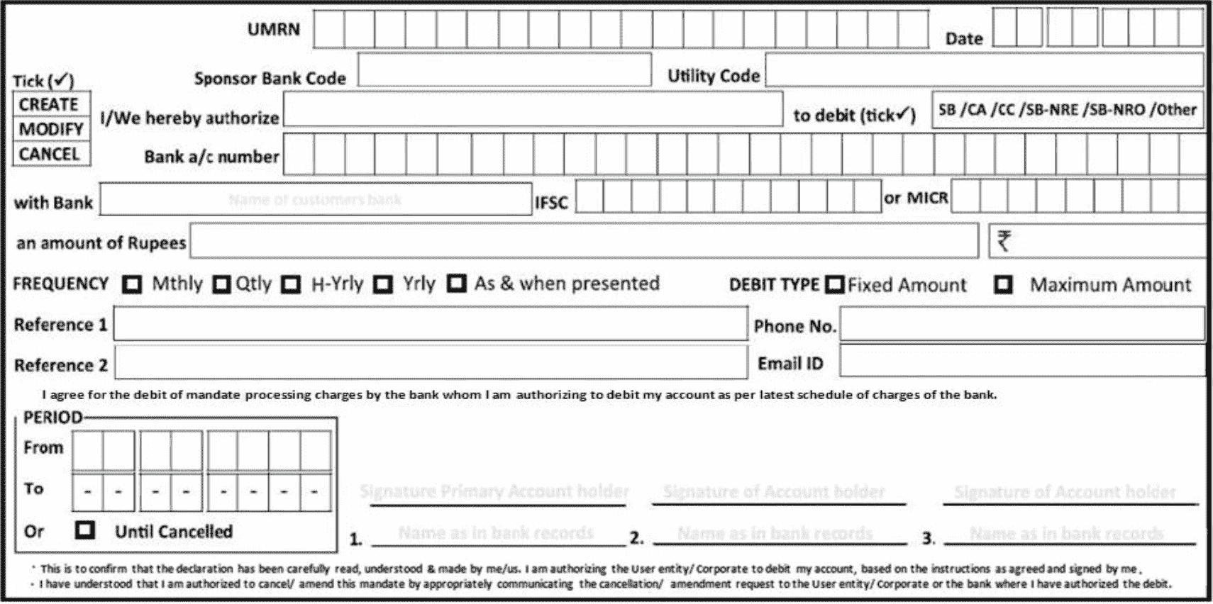 Customers can authorize the subscriptions using only their signature and bank account details. There is no requirement to have a debit card / netbanking enabled to set up the mandate. The physical NACH form includes several fields that can be pre-filled to simplify the process. Leave the UMRN (Unique Mandate Reference Number) field blank when creating a mandate. Telr will provide values for the Sponsor Bank Code, Utility Code, and Authoriser Information. Refer the below sample physical mandate.