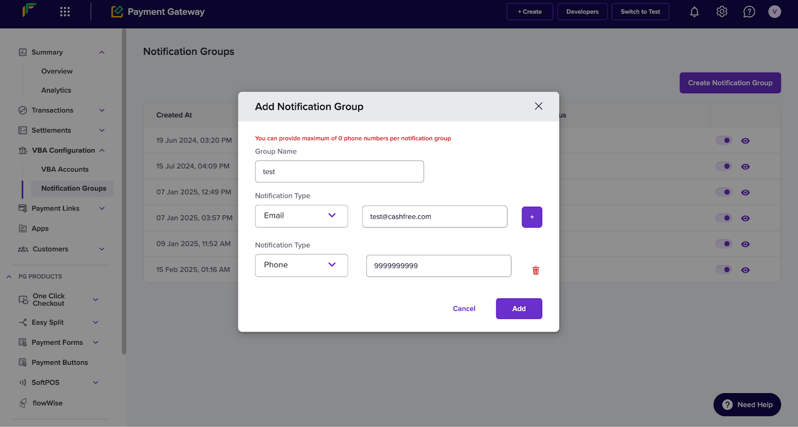 - Click Add to create the notification group.
