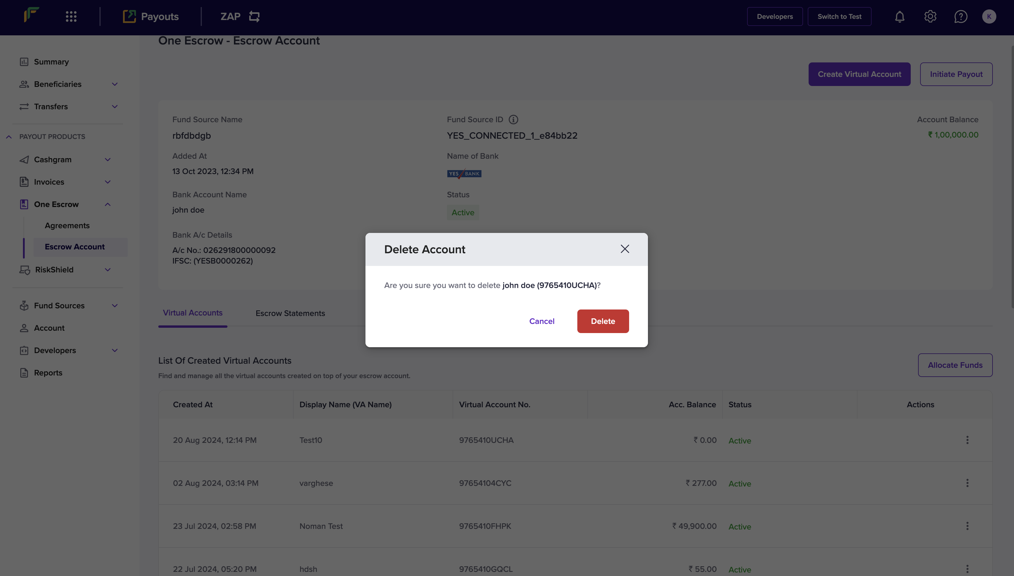 - Click the ellipses icon against the virtual account you want to delete, and click Delete.
