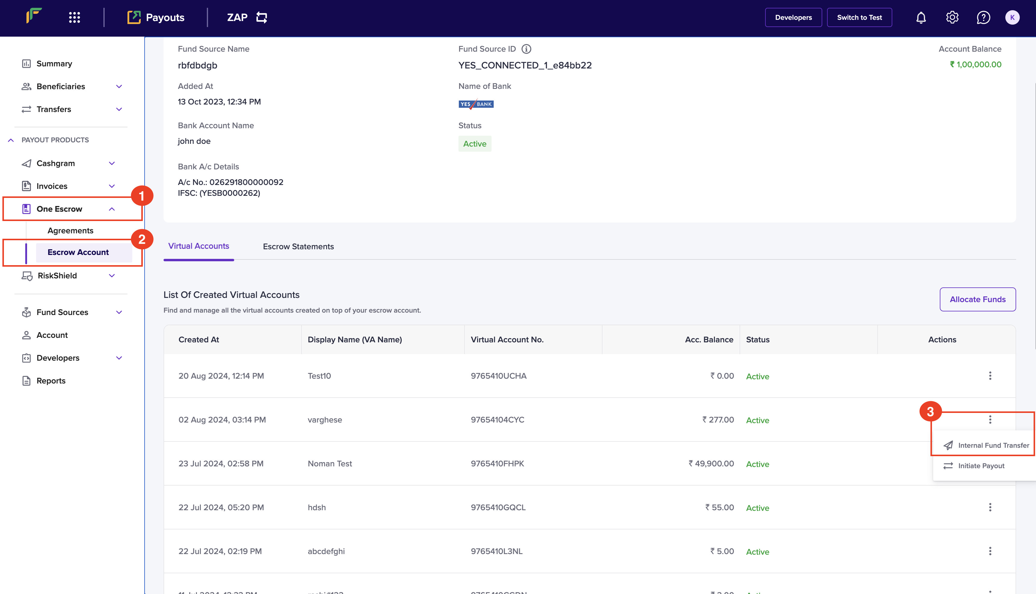 - Click the ellipses icon from the list of created virtual accounts, and click Internal Fund Transfer.