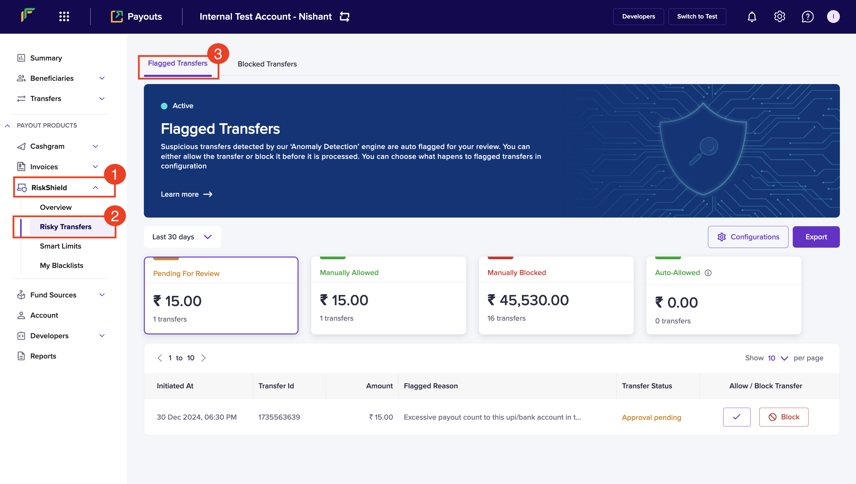 - Navigate to Payout Protect > Risky Transfers. By default, you will land on the Flagged Transfers tab.