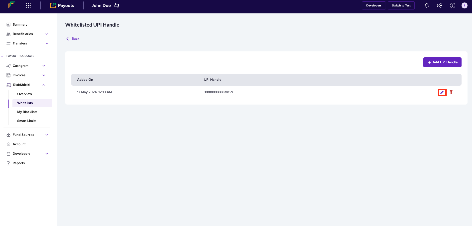 You can view the complete list of any whitelist type - UPI Handle, Mobile Numbers, Email IDs, and Bank Accounts. The Whitelists screen provides you with the information of each whitelist type. Click a whitelist type to view and drill-down its complete information.Edit whitelist Information