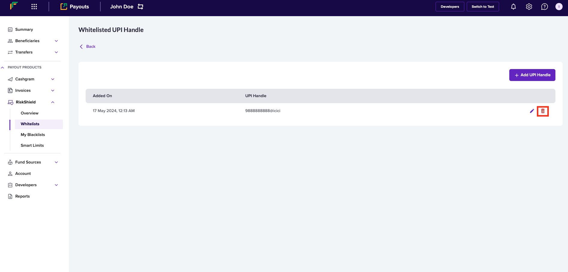 Follow the instructions below to delete a beneficiary’s UPI VPA information from your whitelist:- From the list of UPI information, click the Delete icon against the UPI information that you want to delete.