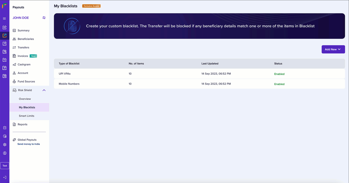 My Blacklists allows you to block a beneficiary by adding any of the information: mobile number, email ID, UPI VPA, and bank account. Once you login to the Payouts dashboard using your credentials, navigate to Payout Protect > My Blacklists.