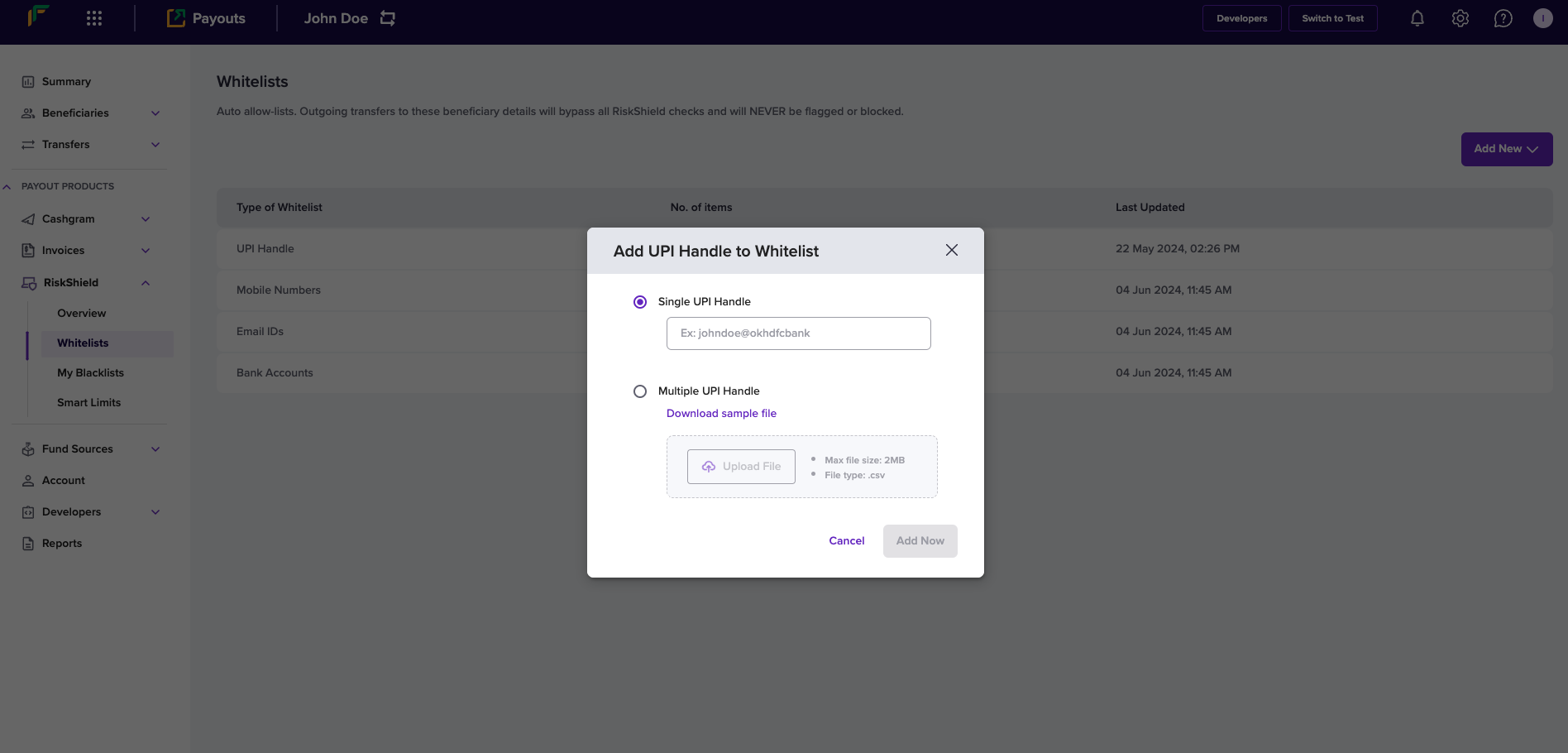 Whitelists allows you to always initiate a transfer to a beneficiary by adding any of the information: mobile number, email address, UPI VPA, or bank account information. Once you login to the Payouts dashboard, navigate to Payout Protect> Whitelists.