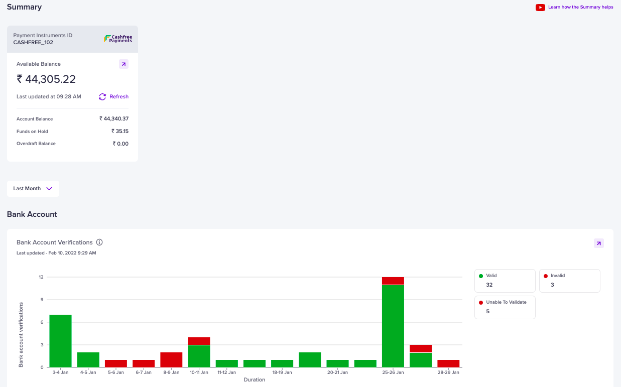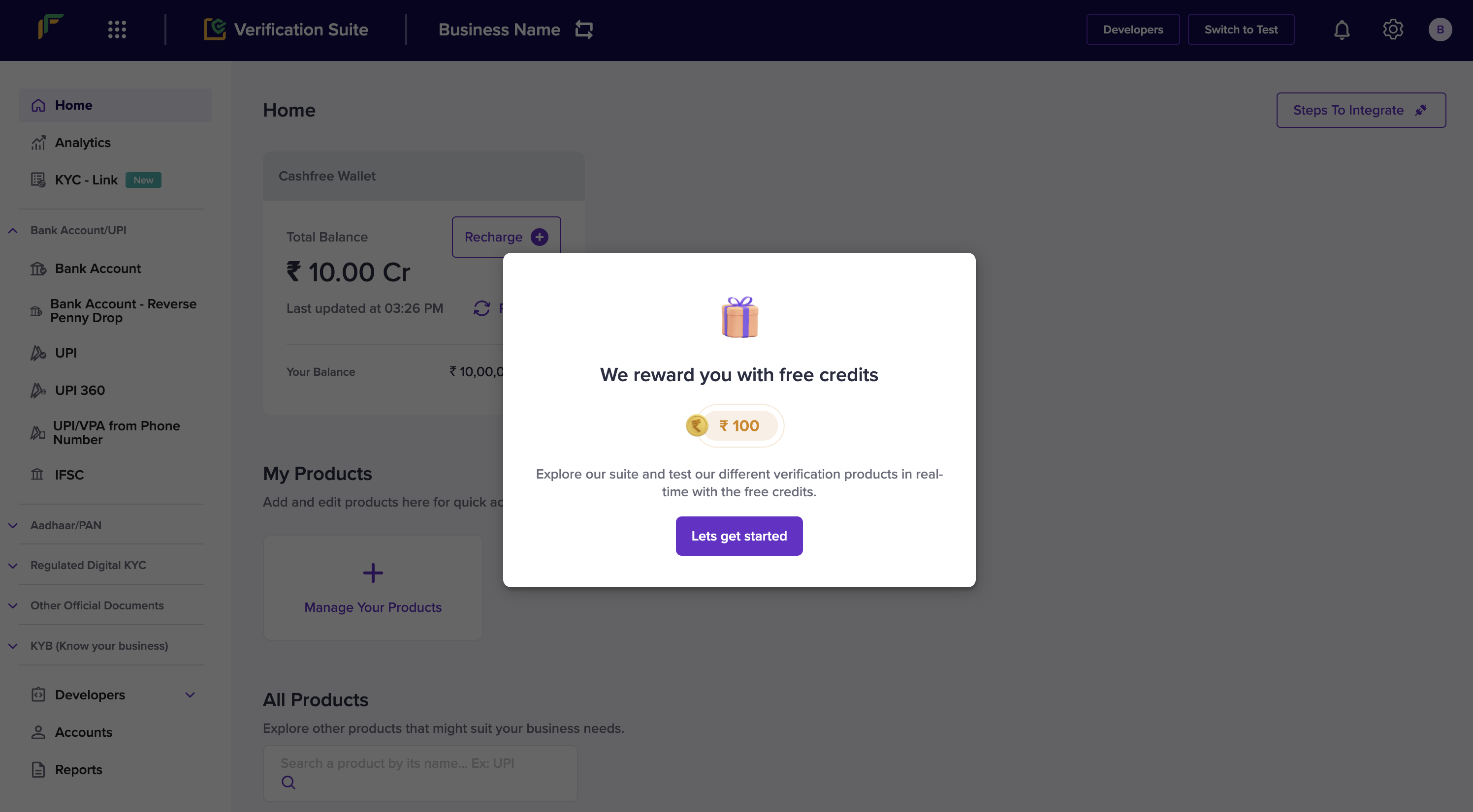 👍 Verify Bank Accounts, Aadhaar, PAN, and more for free! Use free credits to verify your beneficiary details like bank accounts, UPI, PAN, and others at zero charges. With this limited-time offer, experience and test any Verification Suite feature without paying any verification charges. A popup displays the offer for you on the Home screen once you log in. Click Lets get started and instantly redeem the credits to your account.