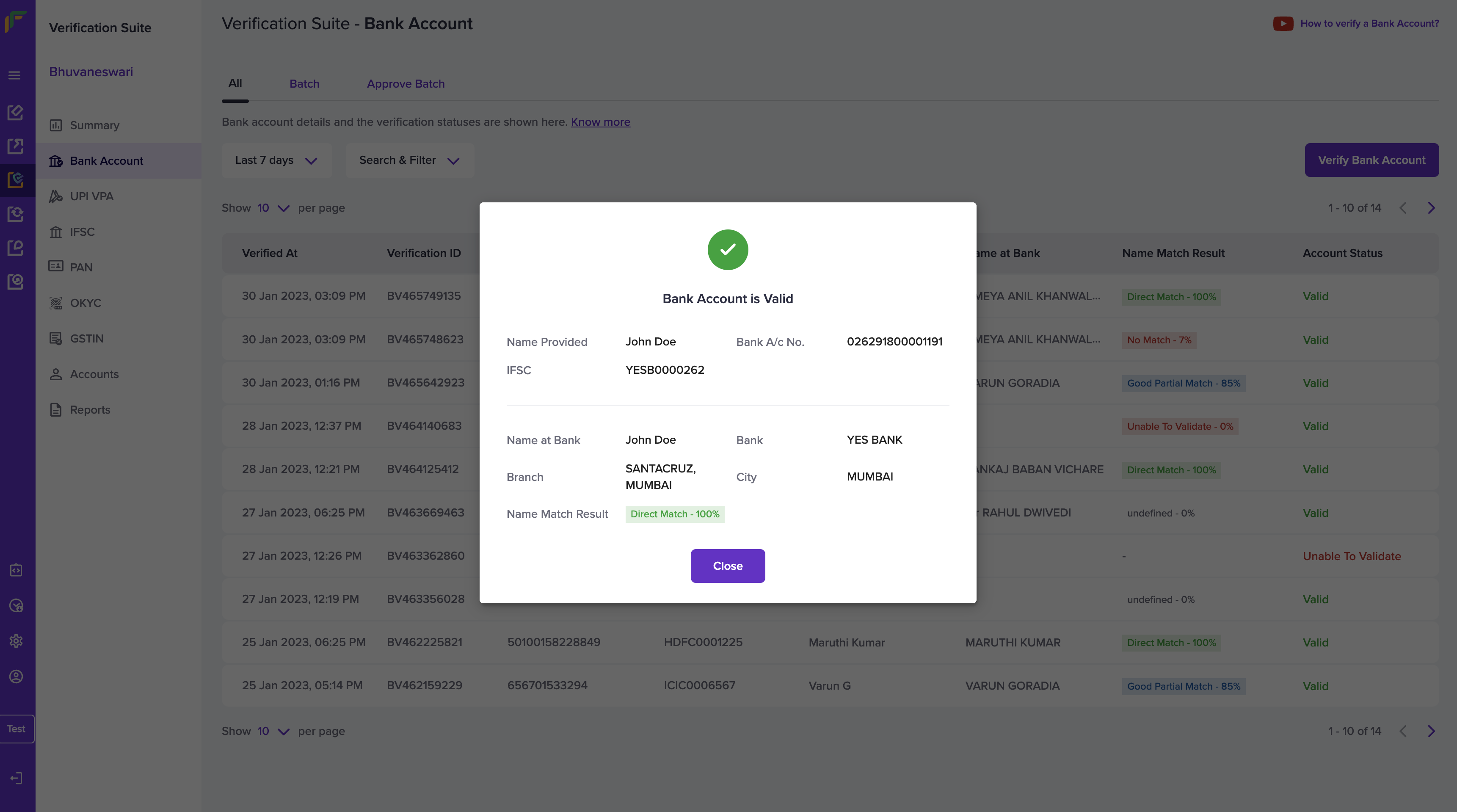 Follow the instructions below to verify domestic bank accounts:- Log in to the _ Verification Suite_ dashboard using your credentials.
