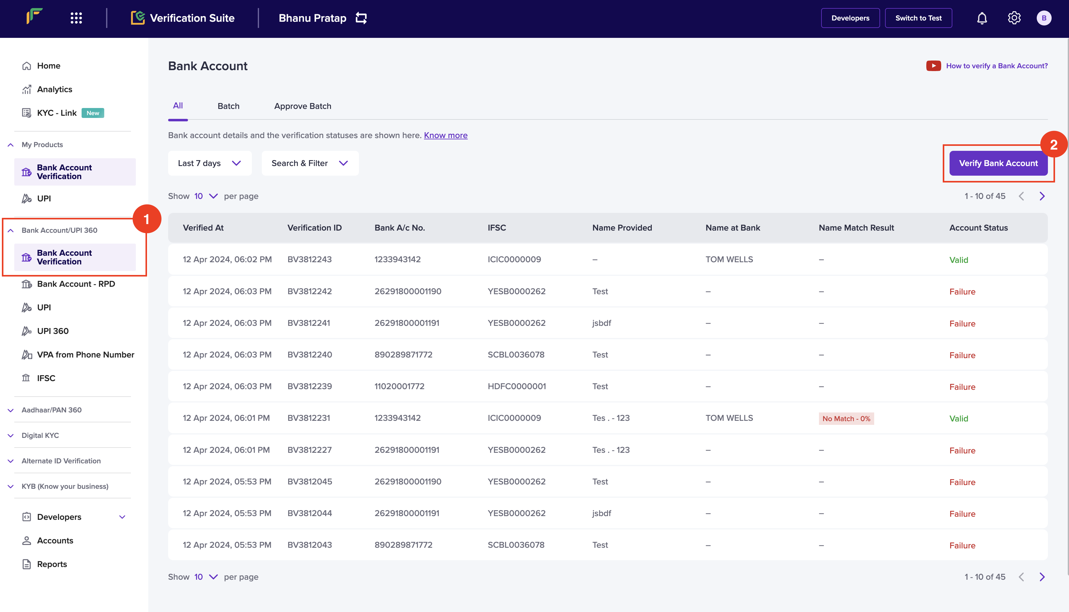 You can verify your beneficiary bank account details at no charge using the free credits. With this limited-time offer, experience and test the feature without paying any verification charges.- From the Verification Suite dashboard, click Verification Suite - Bank Account.
