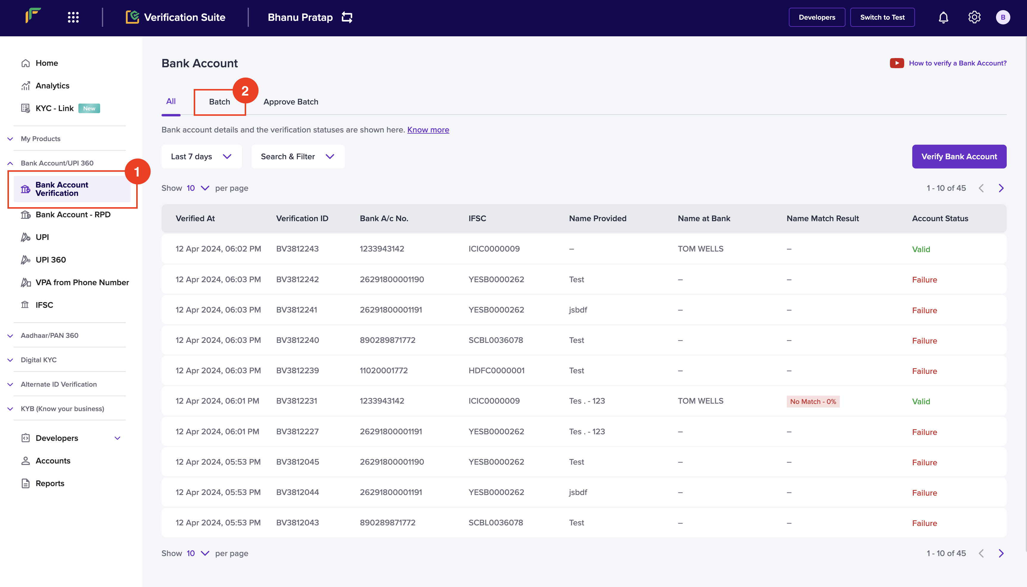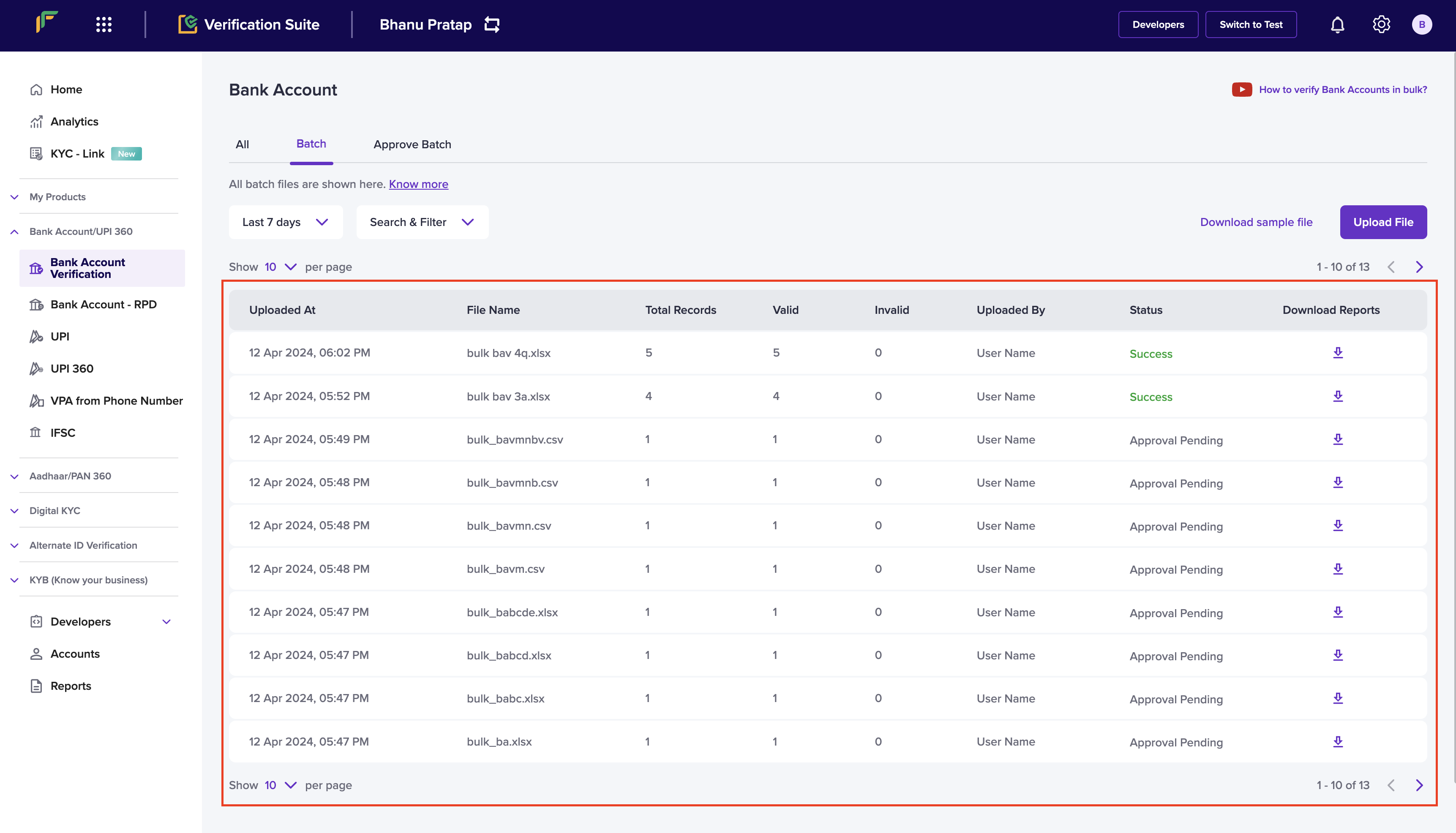 When you have a large number of bank accounts to be verified, you can upload a single file with all the details to verify the accounts in one go, or use the bulk bank account verification API. To verify all the bank accounts, you must upload a .csv, .xls, or a .xlsx file that contains the account number, IFSC, account holder name and phone number of the accounts you want to verify. Download the sample file to know how the details must be filled in the file. Follow the instructions below to upload a batch file:- Log in to the Verification Suite dashboard using your credentials.