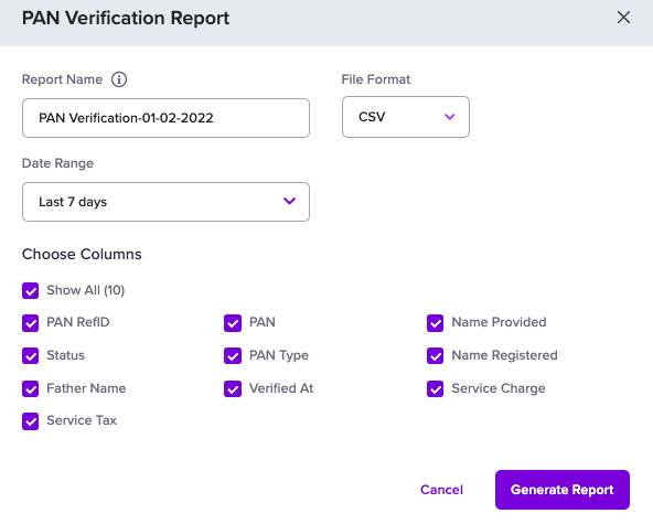 - Go to the Verification Suite Dashboard > Reports > select PAN Verification in the Report Type field.